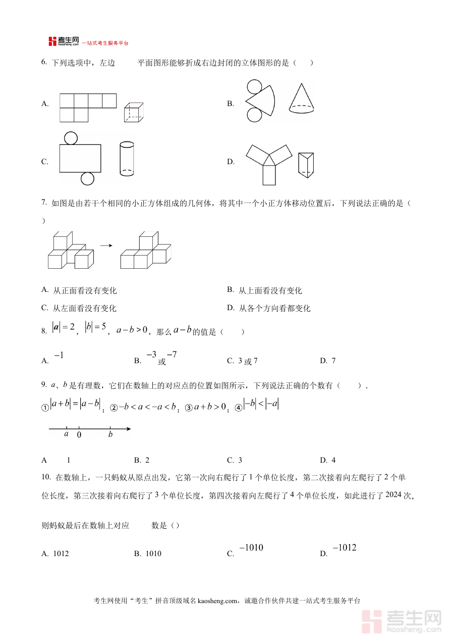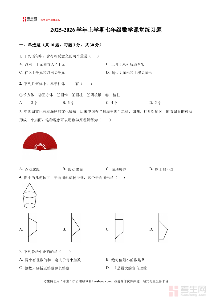 该资料可用于学生进行自我学情诊断,通过完成原卷内容了解自身在七年级上学期数学学习初期的知识掌握情况;也可作为教师开展备考规划的参考工具,辅助教师把握该次月考的考查方向与重点范围;同时还能作为阶段检测的素材,帮助师生及时发现学习过程中的薄弱环节,为后续学习与教学调整提供依据。