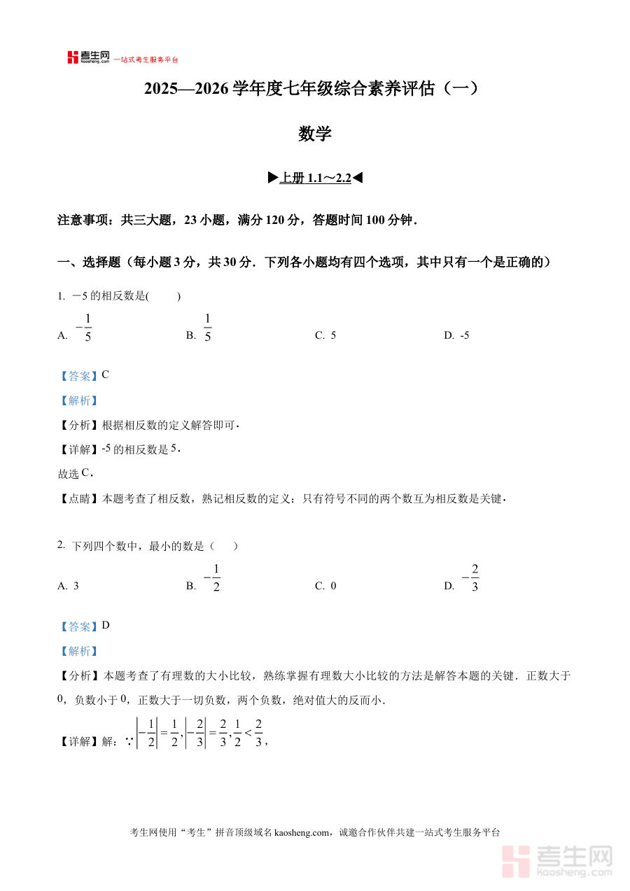 《精品解析:河南省郑州市金水区2025-2026学年上学期七年级数学综合素养评估(一)(解析版)》是面向河南省郑州市金水区2025至2026学年第一学期七年级学生推出的数学学科综合素养评估配套解析资料。该资料紧密贴合当地学期初的综合素养评估场景设置,聚焦七年级数学学科阶段性学习成果的检验需求,为使用者提供与区域考试标准高度契合的解析内容支持,是针对该区域特定阶段数学评估的专业备考辅助材料。