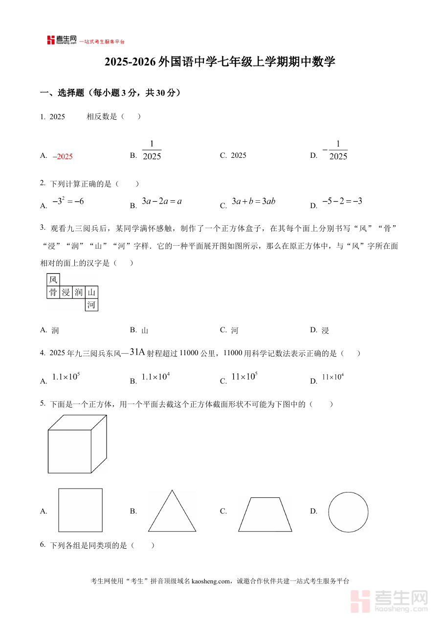 本资料适用于郑州外国语中学2025-2026学年七年级学生、该年级数学教师及学生家长,能帮助学生熟悉本校期中考试形式与要求,也为教师和家长提供阶段检测与复习指导的有效工具,助力学生在期中测试中达成预期学习目标。