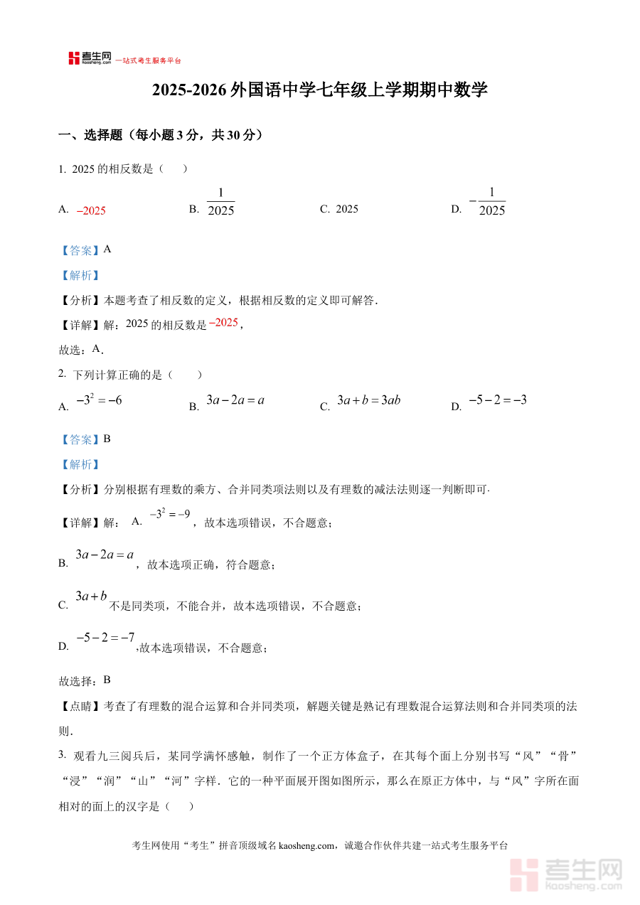 《精品解析:河南省郑州外国语中学2025-2026学年七年级上学期期中考试数学试卷(解析版)》是针对河南省郑州市郑州外国语中学2025-2026学年七年级上学期数学期中考试的专业备考资料。该资料聚焦七年级上学期数学学科的期中阶段考查需求,依托郑州外国语中学的期中测试体系,为使用者提供与该校期中数学考试直接相关的解析内容,有助于使用者快速把握该次考试的核心方向,提前适应考试的考查模式与要求。