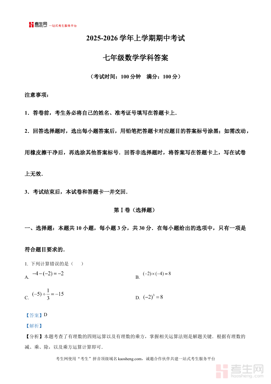 《精品解析:河南省郑州市第五十四中学2025-2026学年上学期期中考试七年级数学试卷(解析版)》是针对河南省郑州市第五十四中学2025至2026学年上学期七年级数学期中考试的专项备考资料。该资料聚焦该学年上学期的阶段性学习内容,结合学校期中检测的考查方向,为使用者提供了与本次考试直接相关的解析类资源,能够帮助使用者快速把握该次期中考试的核心考查范围和基本要求。