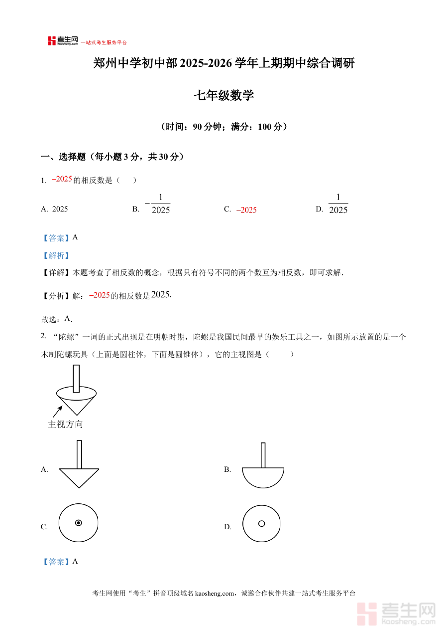 《精品解析:河南省郑州市郑州中学2025-2026学年上学期七年级期中数学试卷 (解析版)》是针对河南省郑州市郑州中学2025至2026学年上学期七年级期中数学考试设计的备考资料,紧密贴合该校该学年七年级上学期的数学教学进度与期中检测要求,为相关使用者提供精准的考试内容参考及专业解析支持。