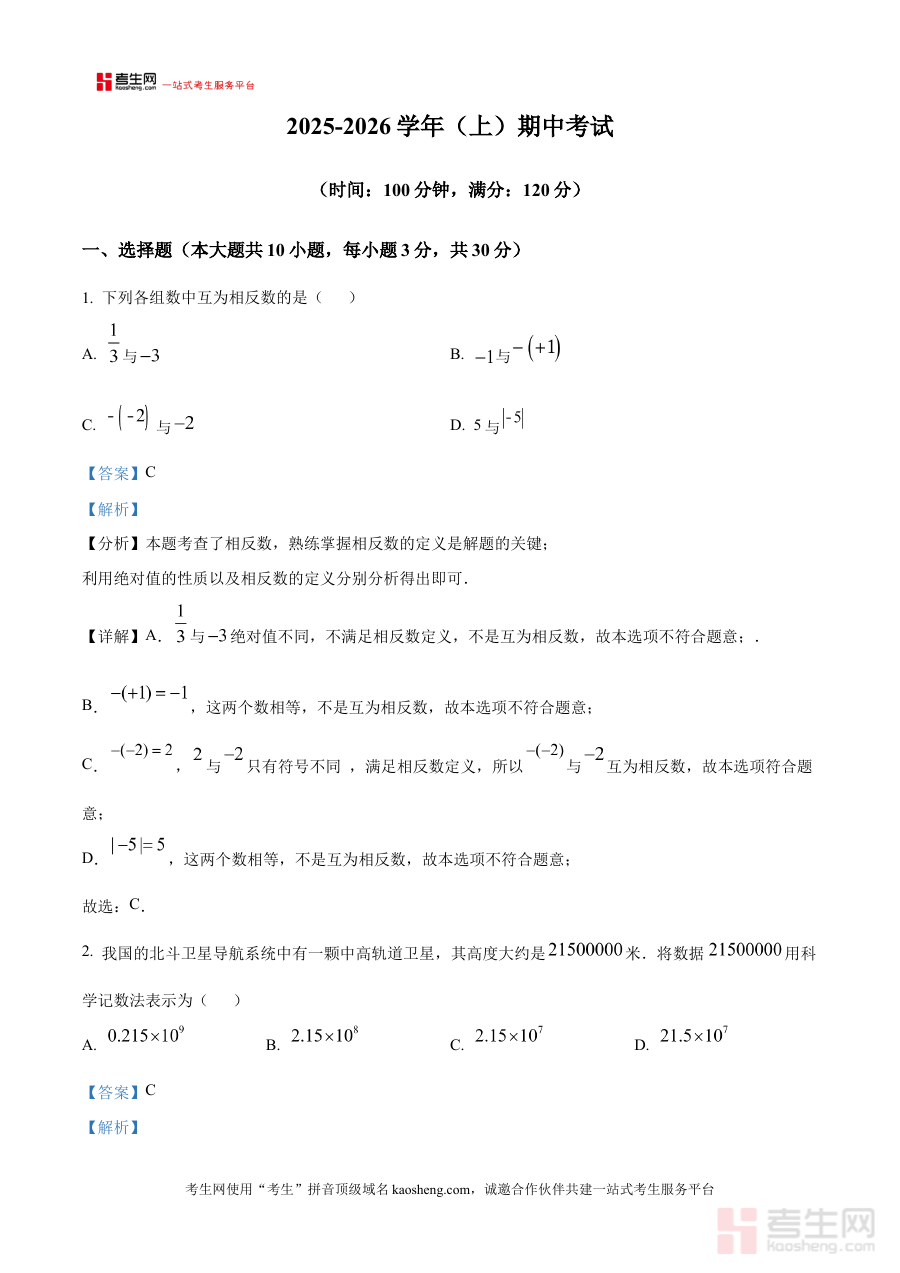 《精品解析:河南省郑州市金水区河南省实验中学2025-2026学年七年级上学期11月期中数学试题(解析版)》是针对2025-2026学年河南省郑州市金水区河南省实验中学七年级上学期11月期中数学考试的专业备考资料,聚焦该阶段数学学科的期中检测需求,为使用者提供与考试直接相关的解析内容。