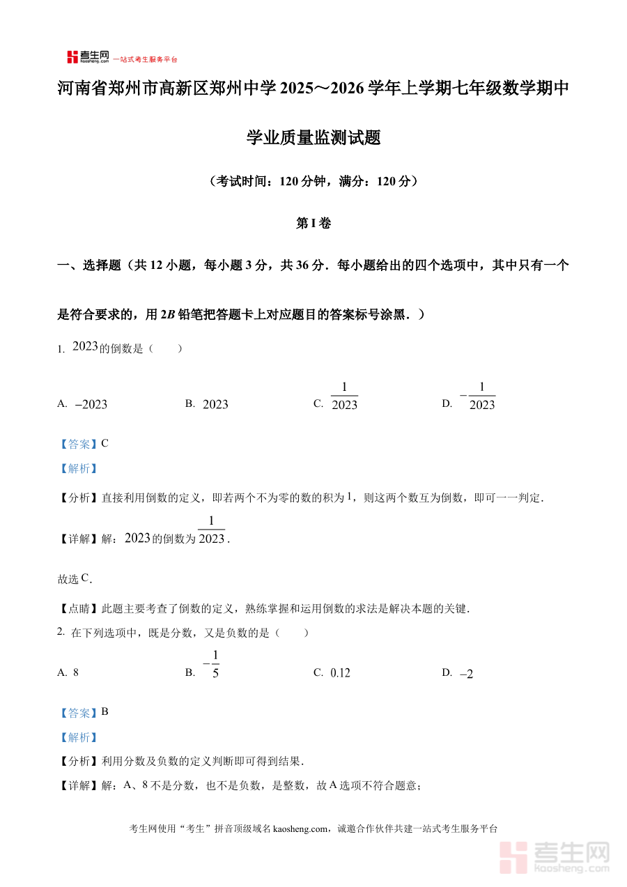 《精品解析:河南省郑州市高新区2025-2026学年上学期七年级数学期中试题(解析版)》是面向河南省郑州市高新区特定区域、特定学年学段的数学期中考查配套资料,精准对应2025至2026学年第一学期七年级学生的期中检测需求,紧密贴合该区域初中数学教学进度与命题特点,为相关使用者提供具有区域针对性的备考支持,是基于本地教学实际与期中考查要求设计的专业复习参考资源。