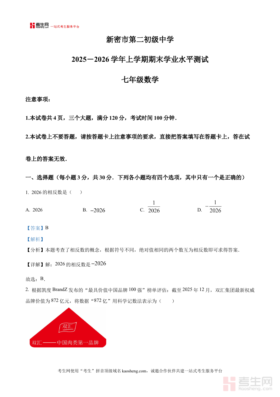 《精品解析:河南省郑州市新密市第二初级中学2025-2026学年上学期 七年级数学期末试卷(解析版)》是针对河南省郑州市新密市第二初级中学2025-2026学年上学期七年级数学期末考试的专项备考资料,精准对应该学段该学科的期末检测场景,为相关使用者提供专业的解析支持。