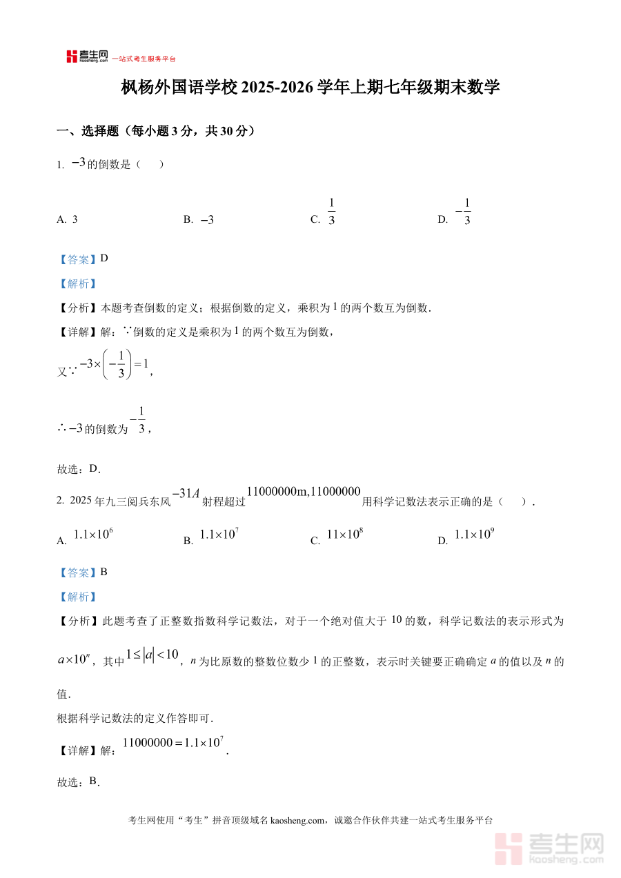 《精品解析:河南省郑州市枫杨外国语学校2025-2026学年上学期七年级期末数学试卷(解析版)》是针对河南省郑州市枫杨外国语学校2025-2026学年上学期七年级期末数学考试的专项备考资料,精准匹配该学校该学年七年级上学期期末数学考试的考查范围与阶段学习要求。