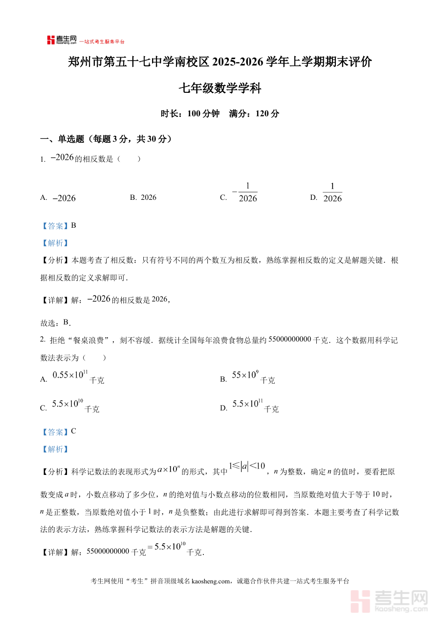 《精品解析:河南省郑州市第五十七中学南校2025-2026学年上学期期末七年级数学试题(解析版)》是针对河南省郑州市第五十七中学南校特定学年学期的七年级数学期末检测的专业备考资料,精准对应2025-2026学年上学期该校七年级数学期末考试的考查范围与标准,为相关使用者提供贴合实际教学进度与考试要求的内容支持,帮助使用者快速把握该阶段期末数学考试的核心方向。
