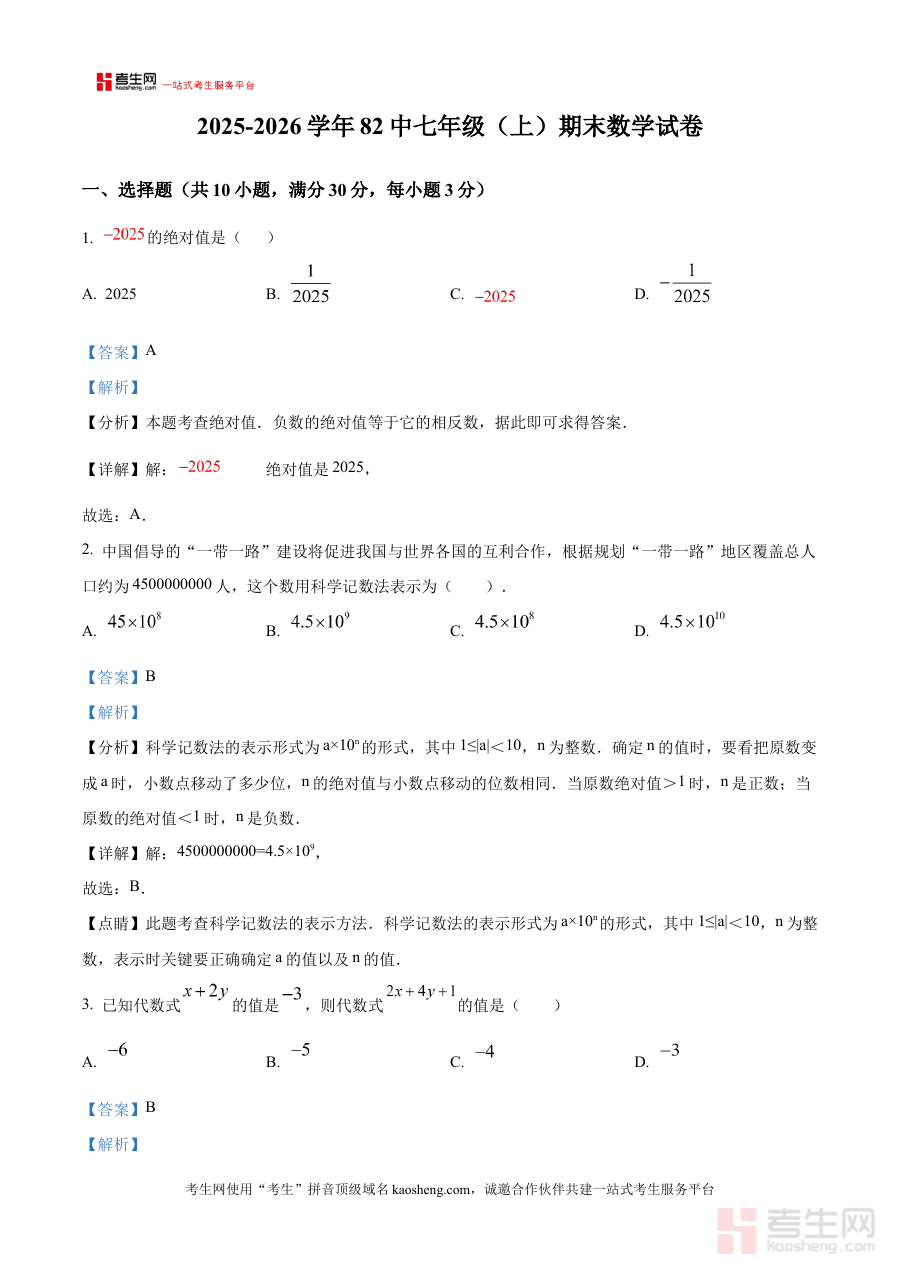 此资料主要适用于河南省郑州市第八十二中学2025-2026学年上学期的七年级学生及该年级数学教师。对学生而言,通过解析内容可清晰把握期末考点分布,优化个人备考策略;对教师而言,能借助资料洞察学生潜在的知识薄弱环节,助力精准教学与备考指导工作。