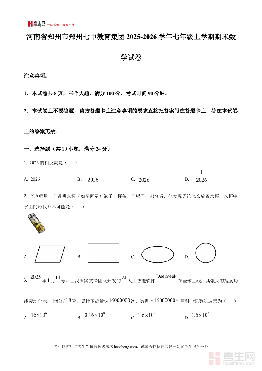 《精品解析:河南省郑州市郑州七中教育集团2025-2026学年七年级上学期期末数学试卷(原卷版)》是针对河南省郑州市郑州七中教育集团2025-2026学年七年级上学期期末数学考试的专用备考资料,紧密贴合该地区该学段的教学进度与考试要求,为使用者提供符合本地教学实际的考试内容参考。