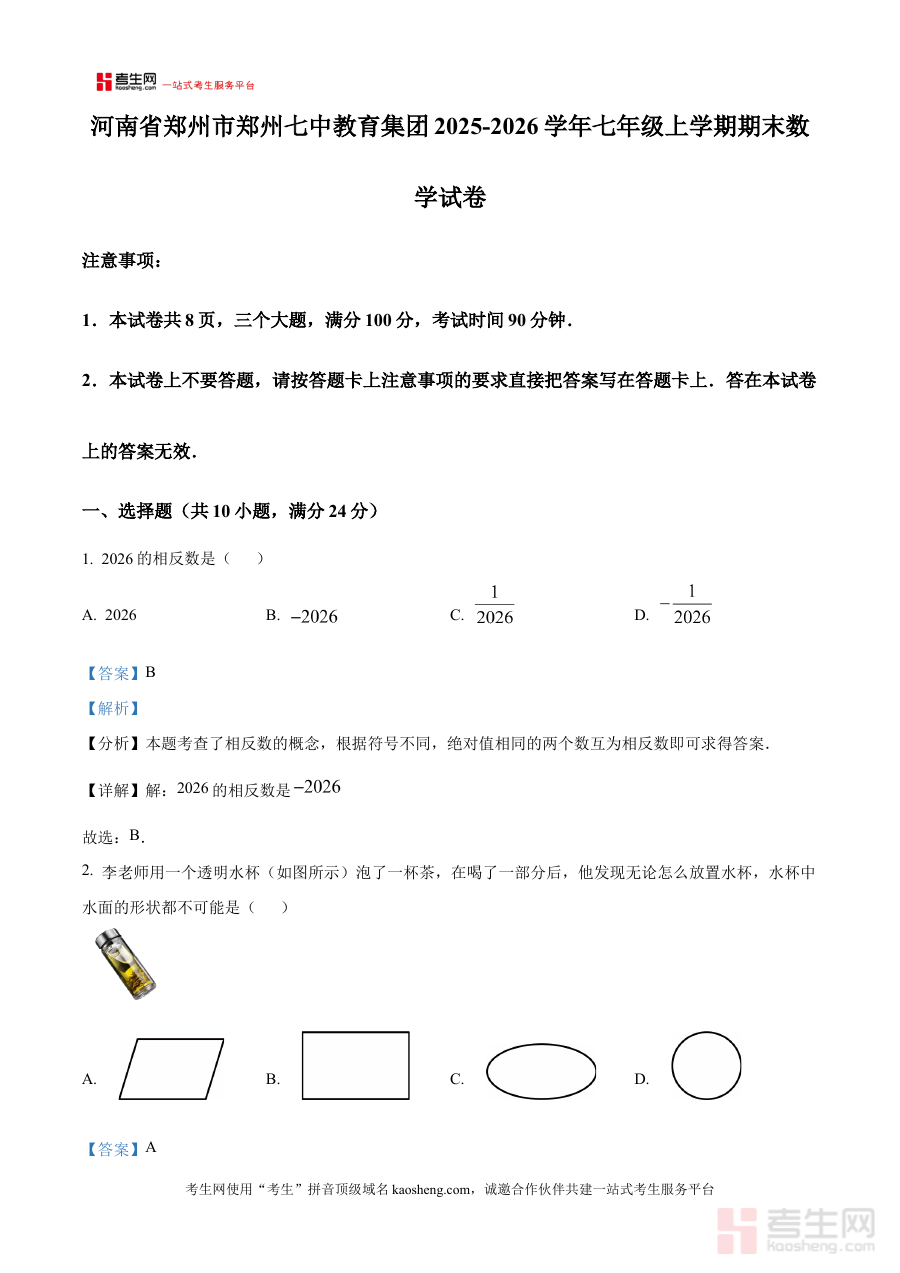 《精品解析:河南省郑州市郑州七中教育集团2025-2026学年七年级上学期期末数学试卷(解析版)》是针对河南省郑州市郑州七中教育集团2025-2026学年七年级上学期期末数学考试的专业备考资料,紧密贴合该阶段数学学科的期末检测目标,为使用者提供与考试直接关联的参考内容。