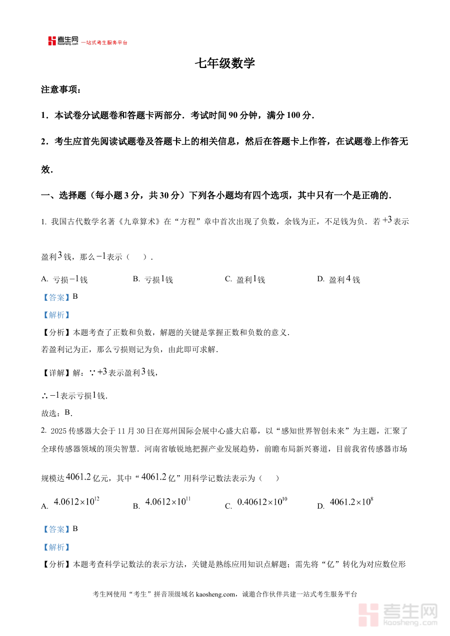 《精品解析:河南省郑州市金水区第一中学2025-2026学年七年级上学期期末数学考试试卷(解析版)》是针对河南省郑州市金水区第一中学2025-2026学年七年级上学期期末数学考试的配套备考资料,聚焦该学年七年级上学期数学学科的期末检测需求,为相关学习者提供针对性的解析支持。