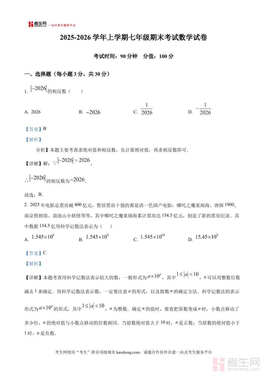 《精品解析:河南省郑州枫杨外国语中学2025-2026学年七年级上学期期末数学试卷(解析版)》是针对河南省郑州枫杨外国语中学2025-2026学年七年级上学期期末数学考试的专项备考资料,聚焦该学年该学段期末数学考试的核心内容,为使用者提供精准的考试方向与解析支持。