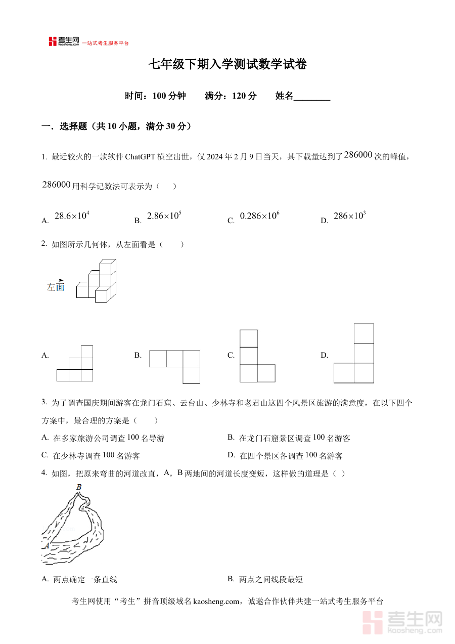 《精品解析:河南省实验中学2024-2025学年七年级下学期入学测试七年级数学试卷(原卷版)》是针对河南省实验中学2024-2025学年七年级下学期入学测试设计的数学备考资料,聚焦该特定学年与地区的入学测试需求,为相关学习者提供原卷形式的备考资源支持。