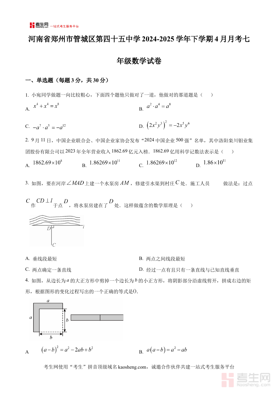 《精品解析:河南省郑州市管城区第四十五中学2024-2025学年下学期4月月考七年级数学试卷(原卷版)》是针对河南省郑州市管城区第四十五中学2024-2025学年下学期4月七年级数学月考设计的备考资料。该资料贴合学校特定学期的教学进度与阶段性考试安排,聚焦七年级下学期数学学科的阶段学习重点,为相关使用者提供与本校实际考试场景高度匹配的资源支持。
