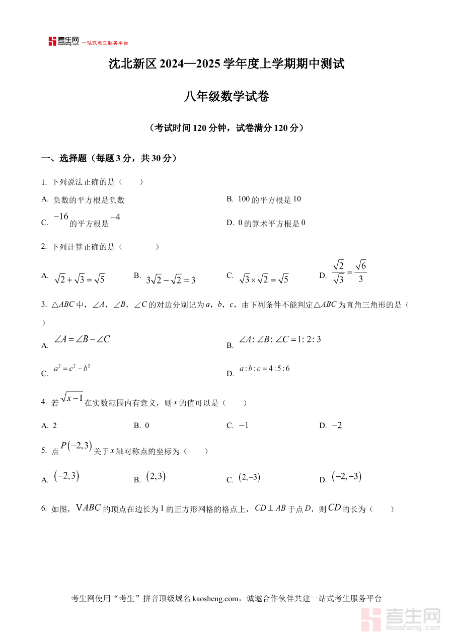 《精品解析:辽宁省沈阳市沈北新区2024—2025学年八年级上学期期中数学试题(原卷版)》是针对辽宁省沈阳市沈北新区2024至2025学年八年级上学期期中数学考试设计的备考资料,紧密贴合该地区该学年八年级数学教学进度与本地期中考试的命题方向,为学生提供与实际考试高度匹配的练习资源。