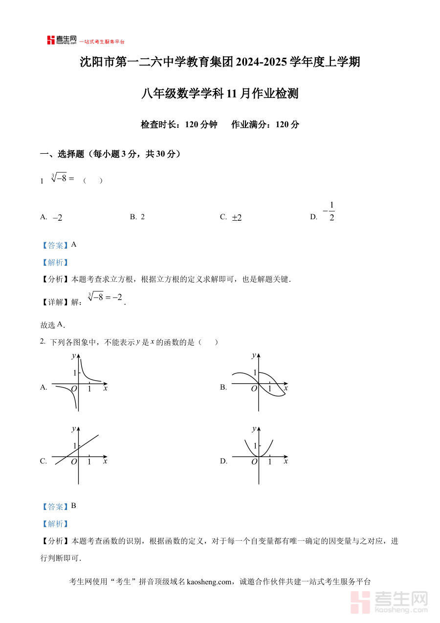 《精品解析:辽宁省沈阳市第一二六中学2024-2025学年八年级上学期期中考试数学试卷(解析版)》是针对辽宁省沈阳市第一二六中学八年级学生在2024-2025学年上学期期中考试设计的数学学科备考资料,紧密结合该学校该学年八年级上学期数学教学进度与期中考查要求,为学生提供贴合实际学习场景的复习辅助依据,帮助使用者快速对接本次期中考试的核心考查方向。