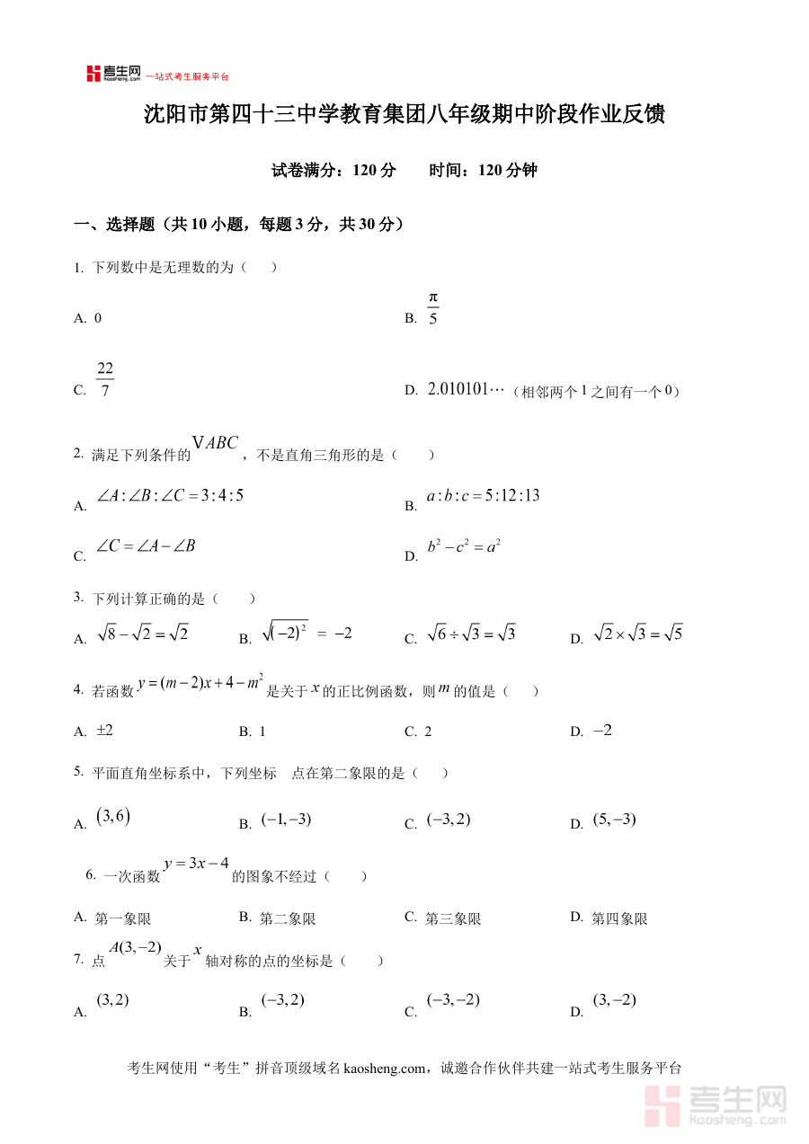 本资料主要适用于辽宁省沈阳市第四十三中学2024-2025学年八年级学生,同时为该校数学教师开展阶段教学评估及备考指导提供参考依据,对家长而言也是辅助孩子制定期中备考规划的实用工具,有助于提升阶段学习的针对性与备考效率。