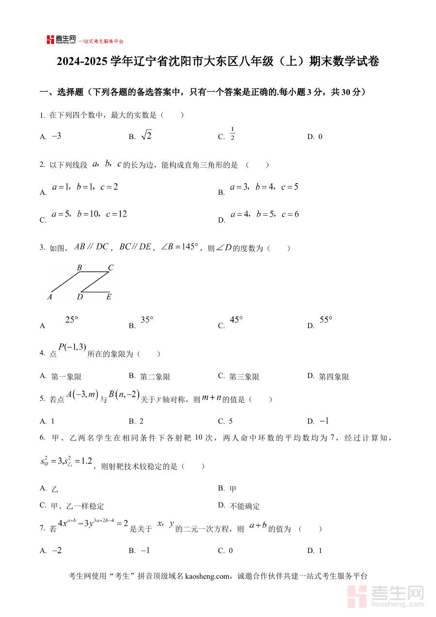 此资料适用于沈阳市大东区的八年级学生、数学教师及学生家长。对学生而言,能通过原卷练习提升应试能力与备考针对性;对教师和家长,则可借助该资料开展学情分析与复习指导,确保备考方向契合本地期末考要求。