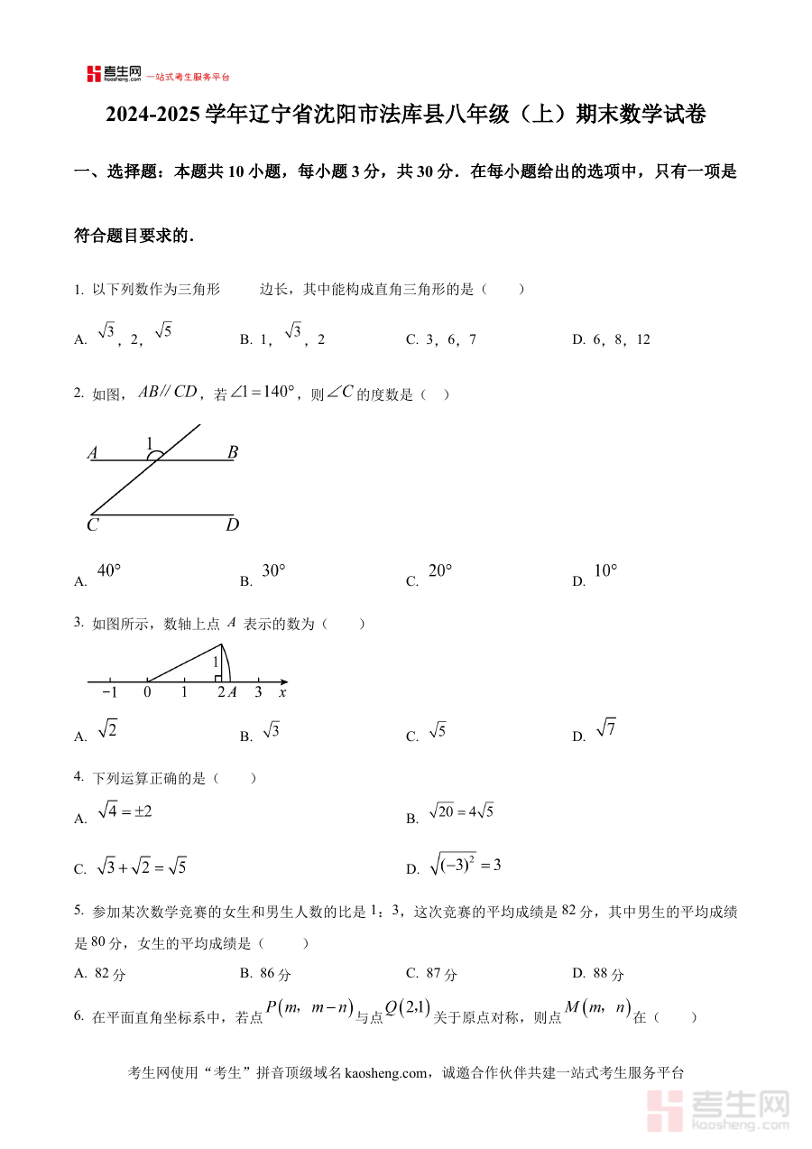 本资料主要适用于沈阳市法库县八年级学生、数学教师及相关教育工作者。对于学生而言,通过使用该原卷版试题能提前熟悉本地期末考试的题型结构与命题风格,增强应试准备的针对性;对于教师,可借助该资料把握本地期末命题趋势,优化教学内容与方法;对于教育工作者,它也能为区域数学教学质量评估提供参考依据,推动教学质量的提升。