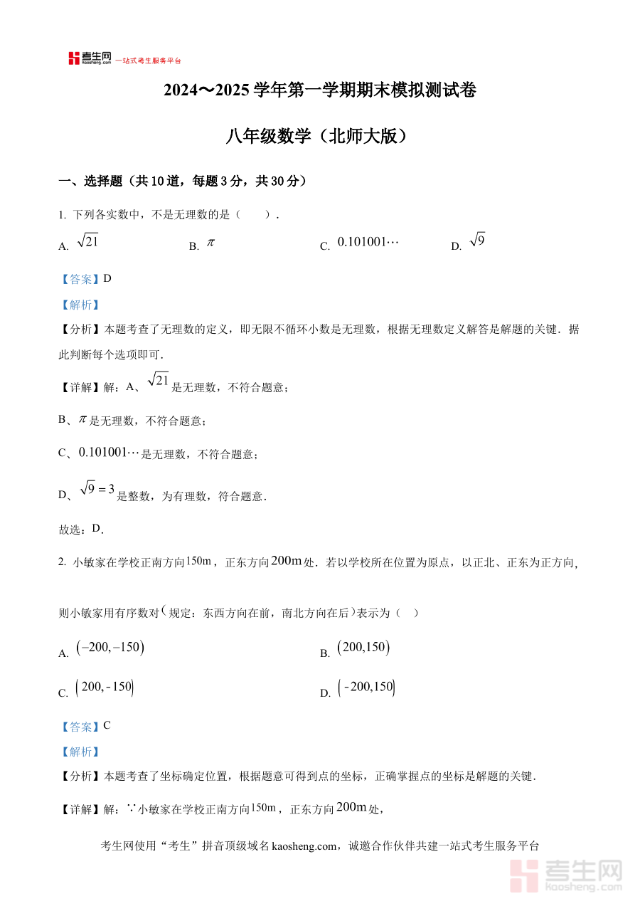 《精品解析:辽宁省沈阳市2024~2025学年八年级上学期北师大版数学期末模拟测试卷(二)(解析版)》是针对辽宁省沈阳市区域内、适配北师大版数学教材的八年级上学期期末阶段模拟备考资料。该资料紧密贴合本学年上学期数学学习进度与沈阳地区期末考的命题方向及考查范围,为使用者提供了与本地考试场景高度匹配的模拟训练资源,是期末备考阶段的重要辅助工具。
