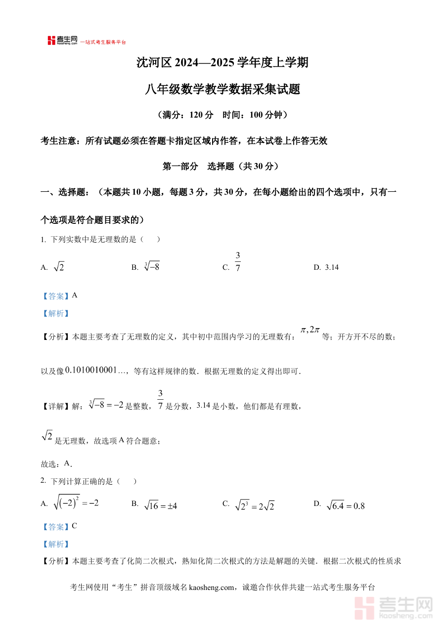 《精品解析:辽宁省沈阳市沈河区2024-2025学年八年级上学期期末考试数学试卷(解析版)》是针对辽宁省沈阳市沈河区特定学年学段数学期末考试的专业备考资料,精准覆盖该学段该学期的数学考查范围,严格匹配沈河区区域内的考试命题方向与要求,为使用者提供与本地期末考高度契合的复习参考资源。