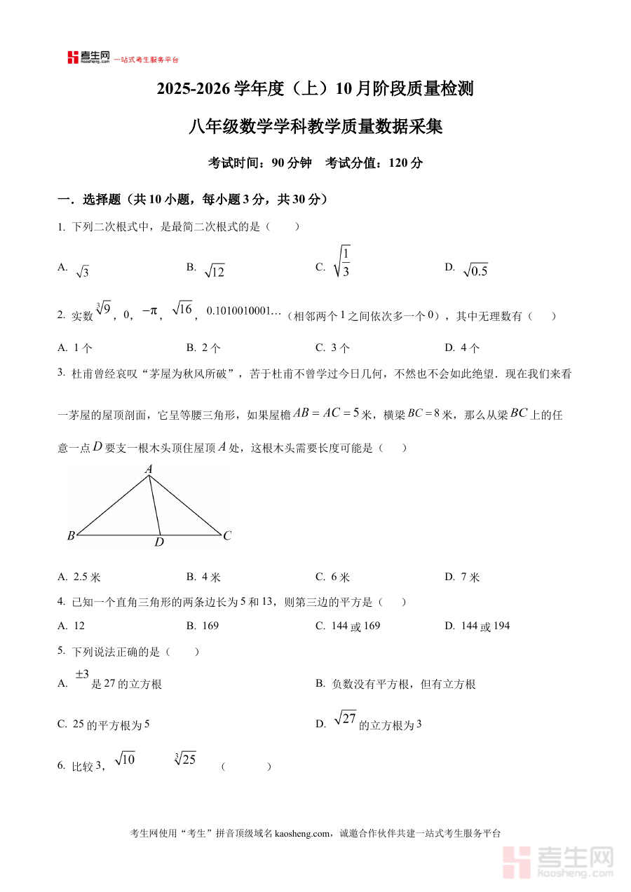 该资料主要适用于沈阳市实验学校2025-2026学年八年级的学生、数学教师及学生家长。对于学生而言,它是进行阶段检测与考前模拟的重要工具,有助于提前熟悉月考的试卷结构与考试流程;对于教师,可作为教学反馈与备考规划的关键参考;对于家长,则能帮助其更深入地了解孩子的学习状态,共同促进学生数学学科能力的提升。