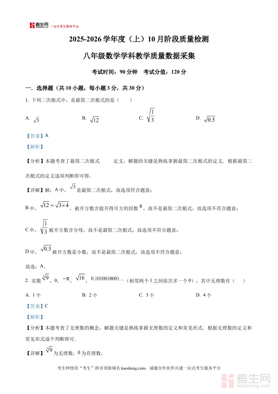 《精品解析:辽宁省沈阳市实验学校2025-2026学年八年级上学期10月月考数学试题(解析版)》是针对辽宁省沈阳市实验学校2025-2026学年八年级上学期10月数学月考打造的专业备考资料。该资料以该校当月实际月考数学试题为核心载体,配套完整详细的解析内容,精准对接该阶段考试的核心要求,为使用者提供与考试场景高度契合的复习支持资源,助力使用者快速熟悉考试形式与考查方向。