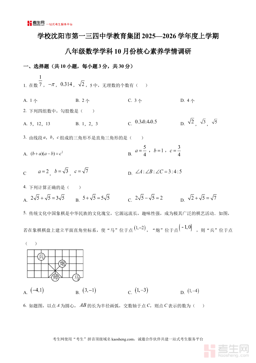《精品解析:辽宁省沈阳市第一三四中学2025-2026学年八年级上学期10月月考数学试题(原卷版)》是针对辽宁省沈阳市第一三四中学2025-2026学年八年级上学期10月数学月考的备考资料,聚焦该阶段学校组织的阶段性考试需求,为学生提供贴合本校教学进度与考试要求的练习载体。
