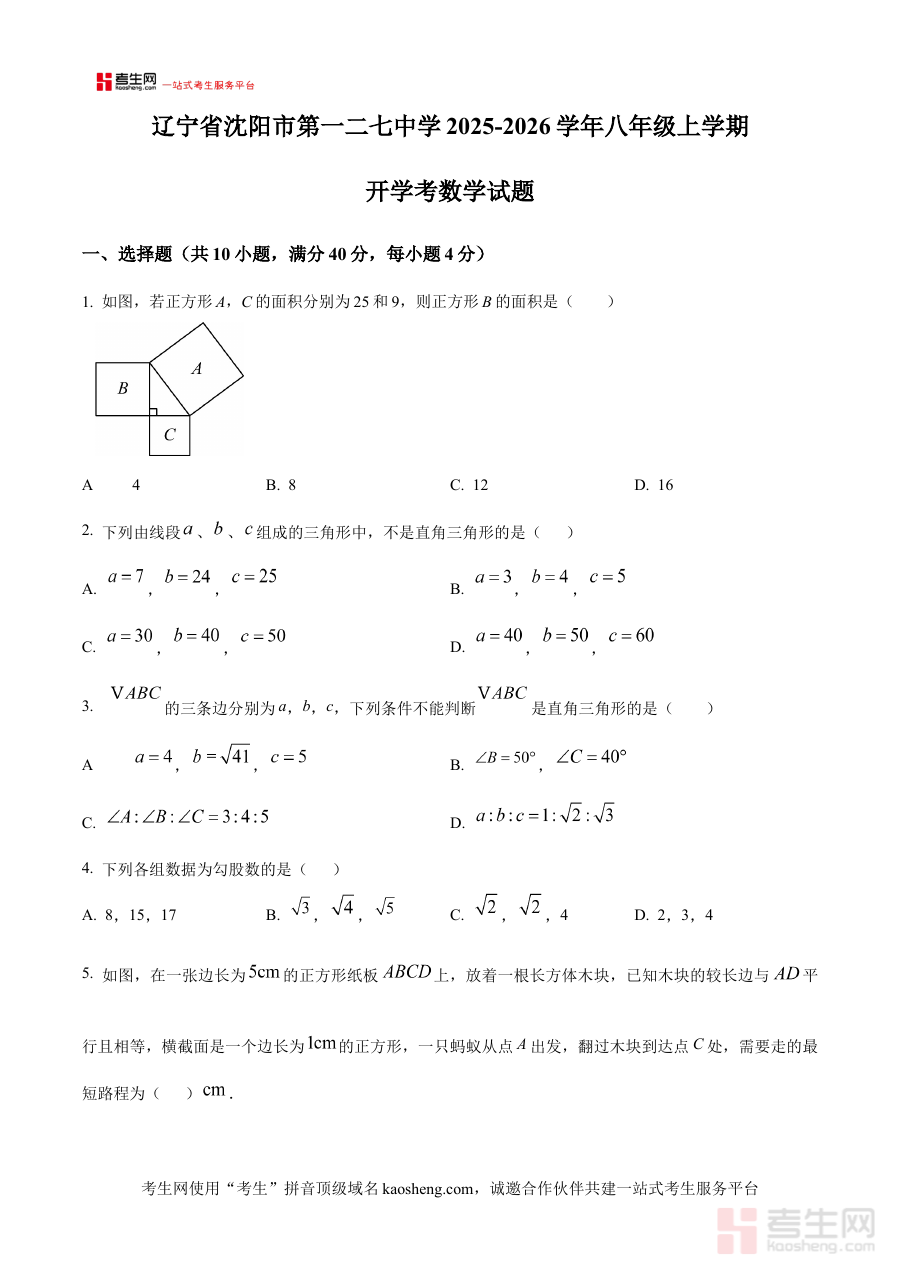 《精品解析:辽宁省沈阳市第一二七中学2025-2026学年八年级上学期开学考数学试题(原卷版)》是针对辽宁省沈阳市第一二七中学2025-2026学年八年级上学期开学数学考试的专用备考资料,明确对应特定学年、学期及考试类型,为学生提供与本校开学考直接相关的练习资源。