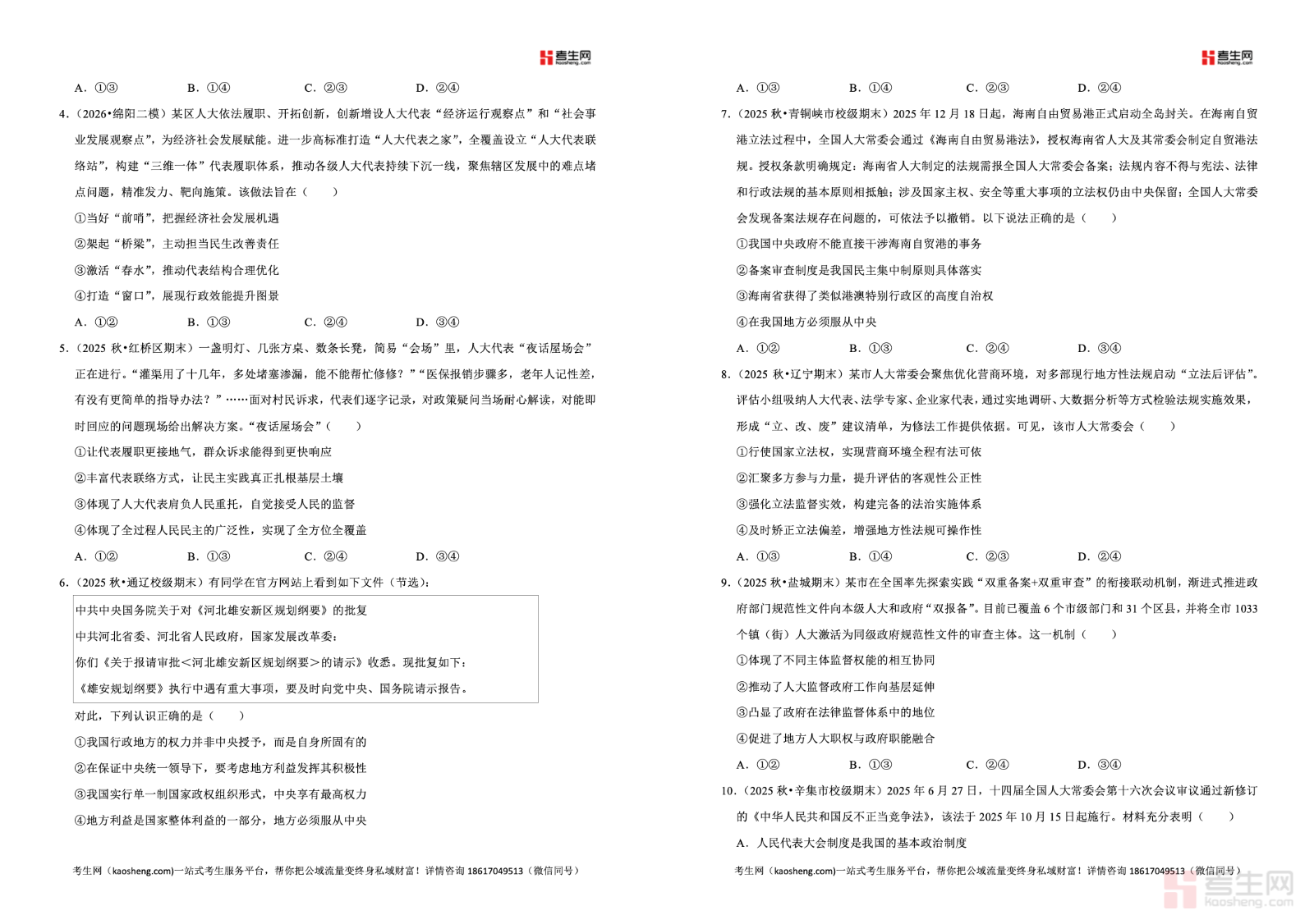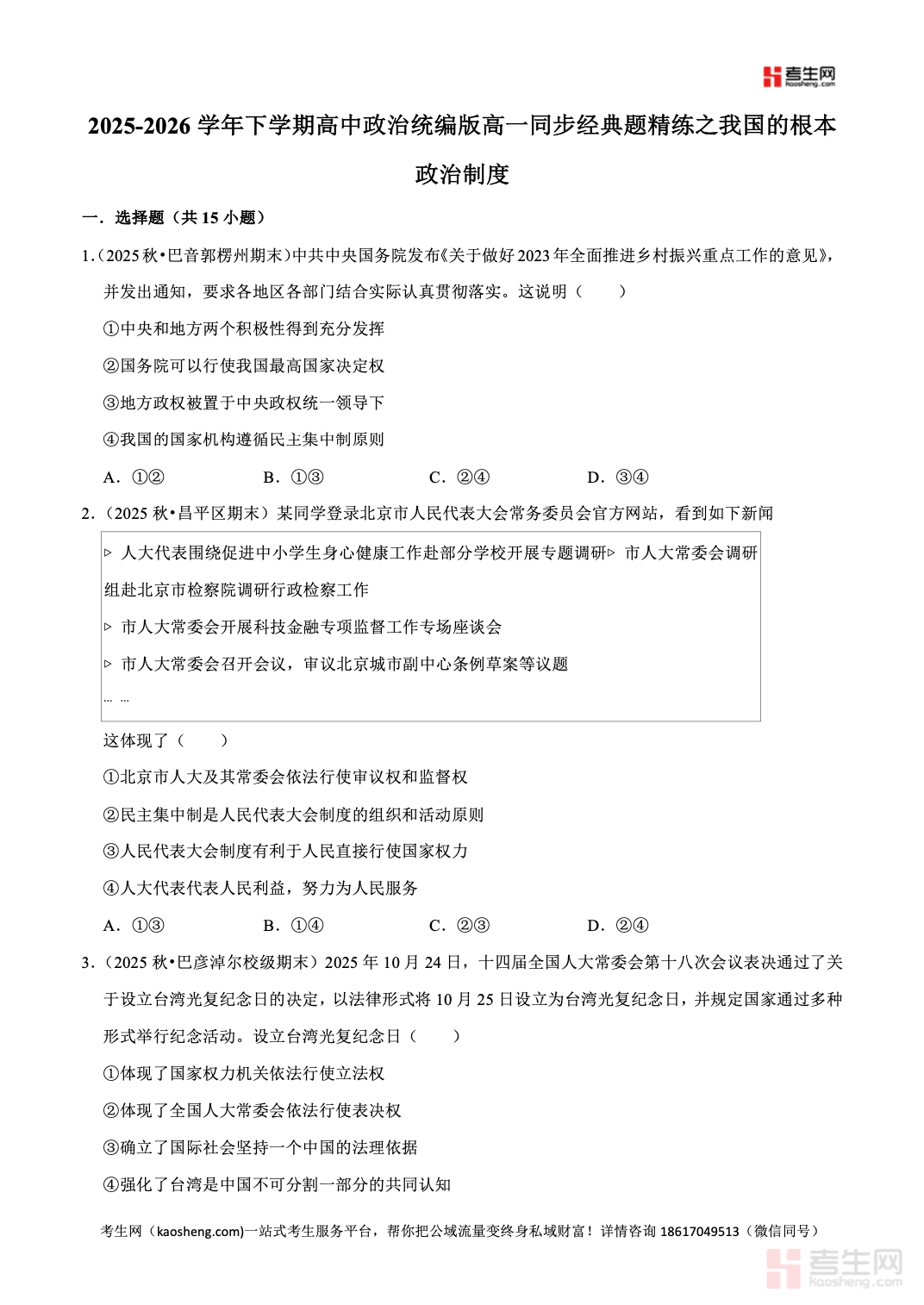 2025-2026 学年下学期高中政治统编版高一同步经典题精练之我国的根本政治制度,紧扣统编版高一政治教材内容,同步课堂教学进度,聚焦人民代表大会、人大代表职权、人民代表大会制度优势、民主集中制、根本政治制度内涵等核心考点,精选选择题、判断题、材料分析题与典型主观题,贴合单元检测与期中期末考情,题目梯度清晰、针对性强。每道试题配有详细答案解析,点明知识要点、答题逻辑、术语规范、易错易混点,帮助学生扎实理解我国根本政治制度相关内容,提升知识运用、材料解读、规范作答能力,适合高一学生同步练习、专项巩固、考前查漏、应试提升,有效提高政治学科素养与考试成绩。请添加微信 18617049513 进专属群,获取更多免费资源!