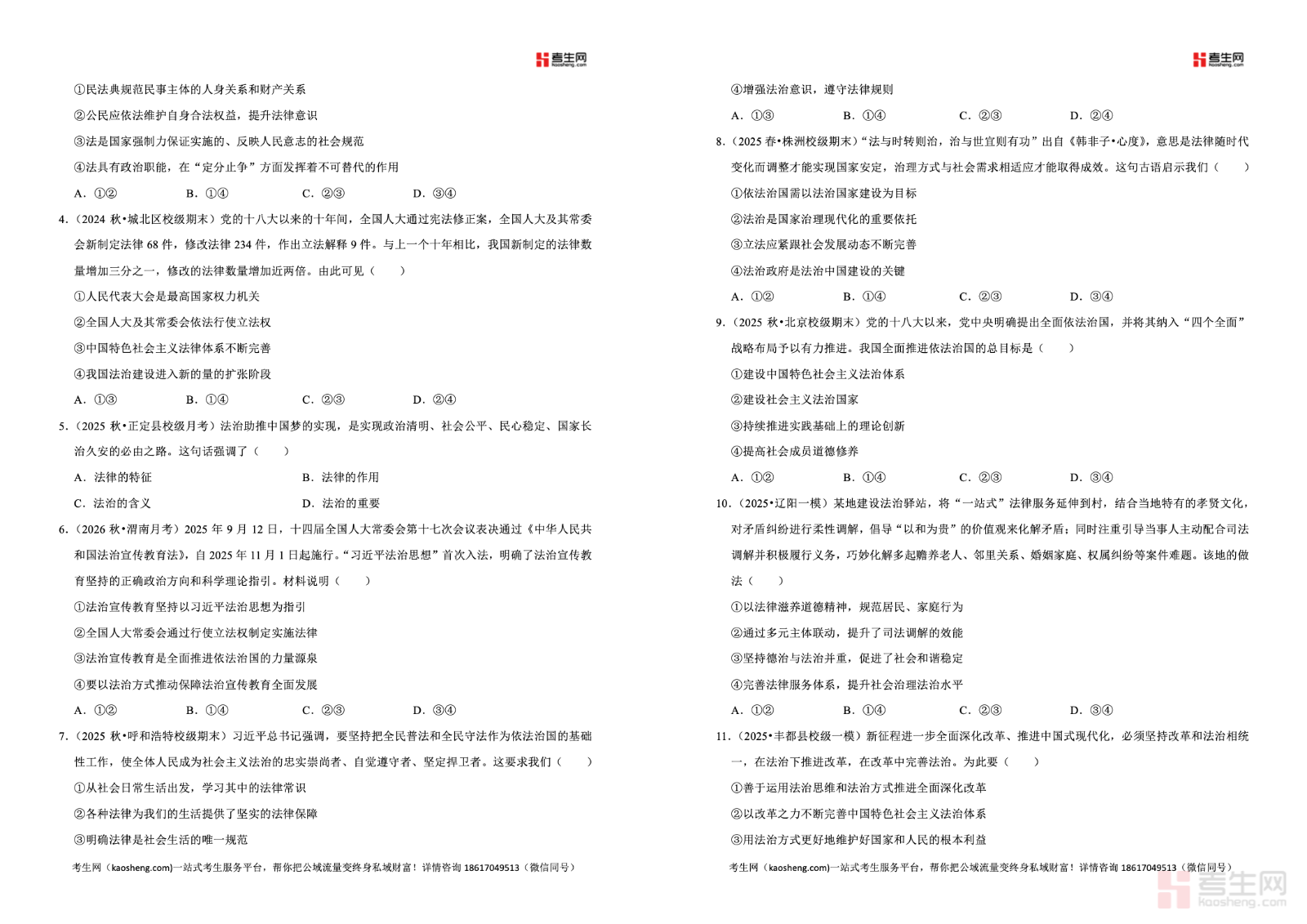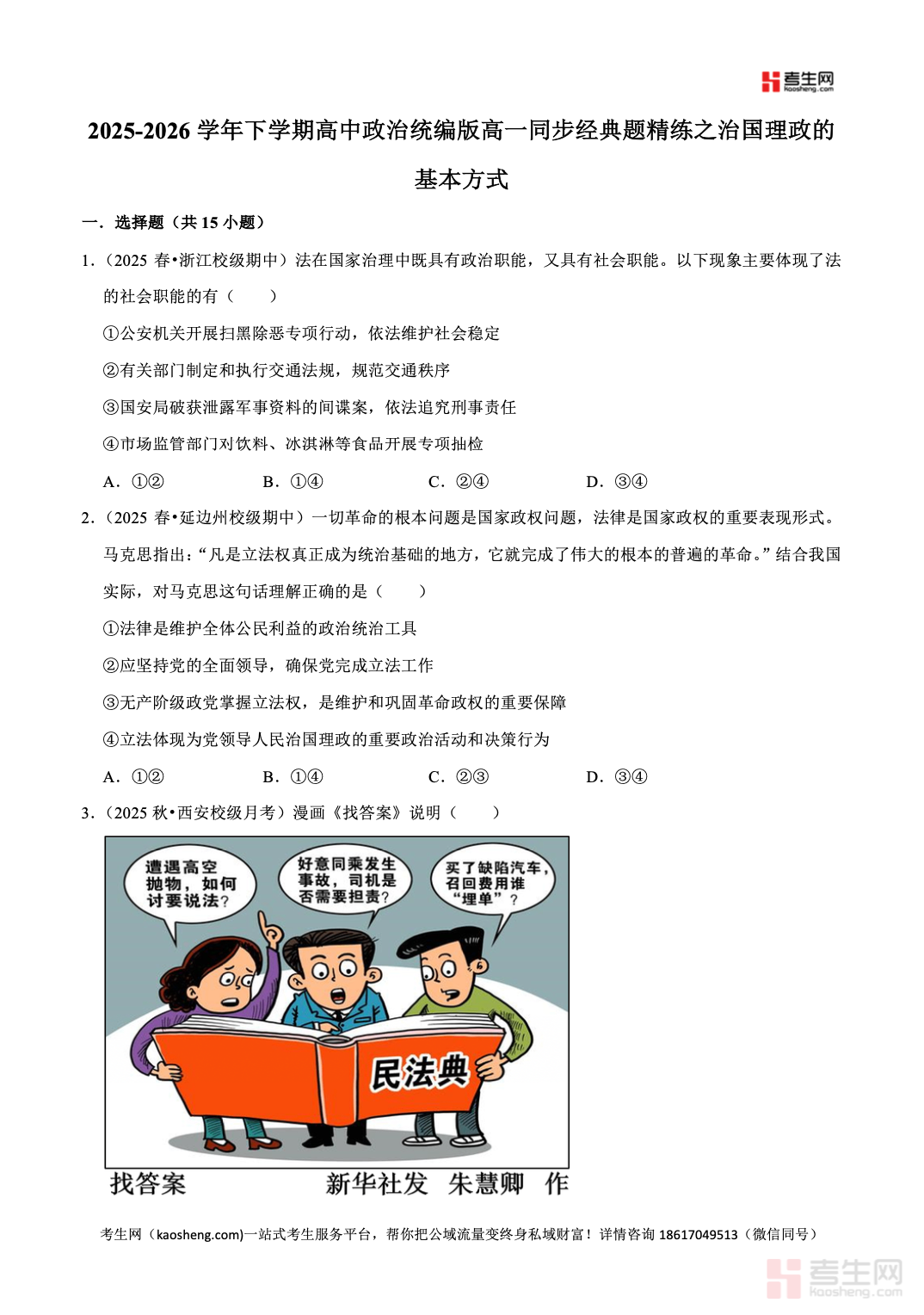 2025-2026 学年下学期高中政治统编版高一同步经典题精练之治国理政的基本方式,紧扣统编版高一政治教材核心内容,同步课堂教学进度,聚焦法治的内涵、法治与人治的区别、依法治国与依法执政、法治国家建设、法治建设的原则与要求等高频考点,精选选择题、辨析题、材料分析题及典型主观题,题型贴合单元检测、期中期末考情,难度梯度合理、针对性极强。每道题目均配有详细答案解析,明确核心知识点、答题逻辑、术语规范、易错陷阱,帮助学生深刻理解法治思维,提升材料分析、知识迁移、规范作答能力,适合高一学生同步练习、单元复习、专项突破与考前查漏补缺,稳步提升政治学科应试水平。请添加微信 18617049513 进专属群,获取更多免费资源!