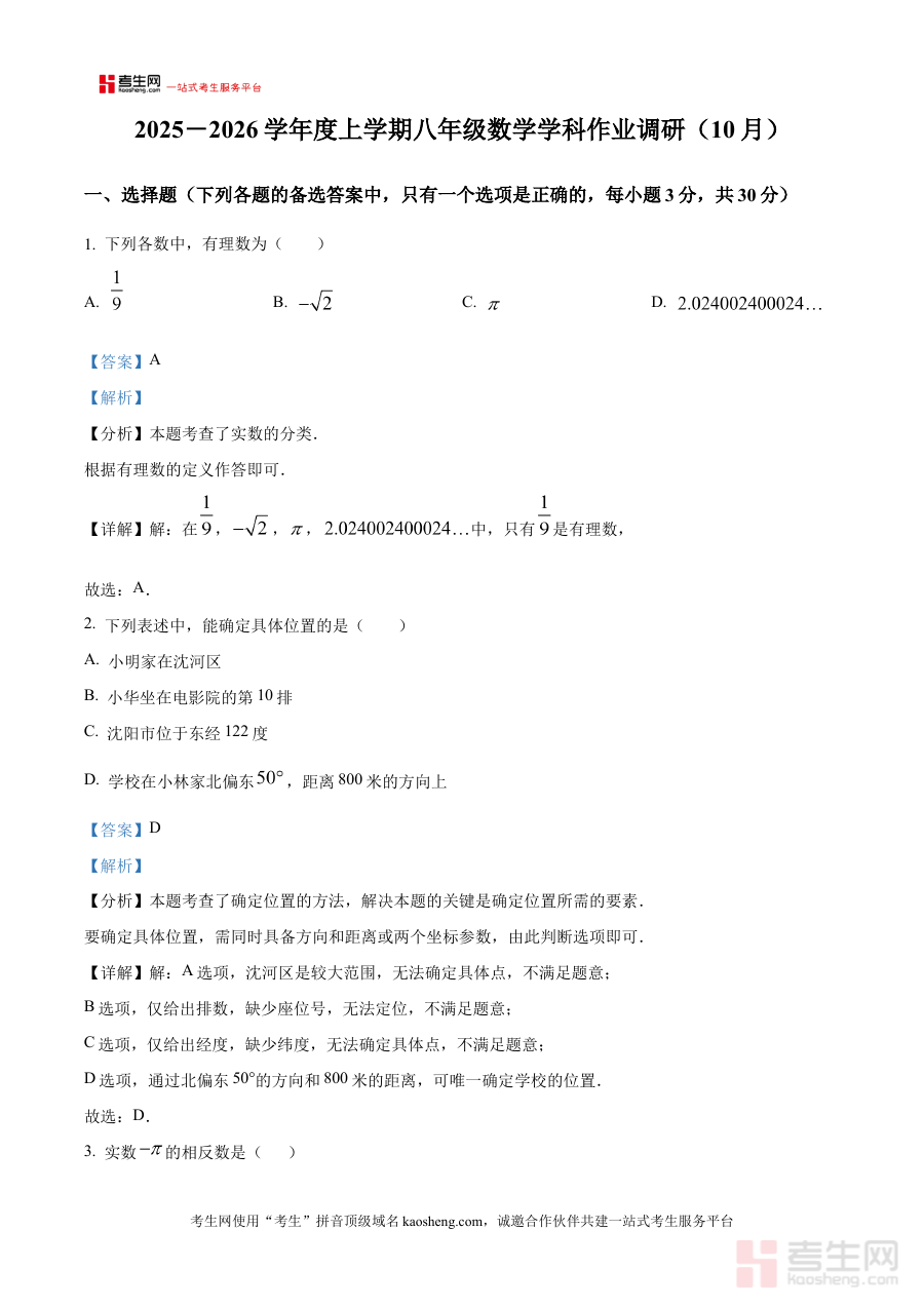 《精品解析:辽宁省沈阳市第七中学2025-2026学年八年级上学期10月学科作业调研数学试题(解析版)》是针对辽宁省沈阳市第七中学2025至2026学年八年级上学期10月开展的学科作业调研数学考试打造的配套解析类备考资料,精准契合该阶段的教学进度与调研考试的核心要求,为学生和教师提供与本次调研考试内容高度匹配的权威参考资源,确保使用者能够获取到贴合考试实际情况的详细解析内容。
