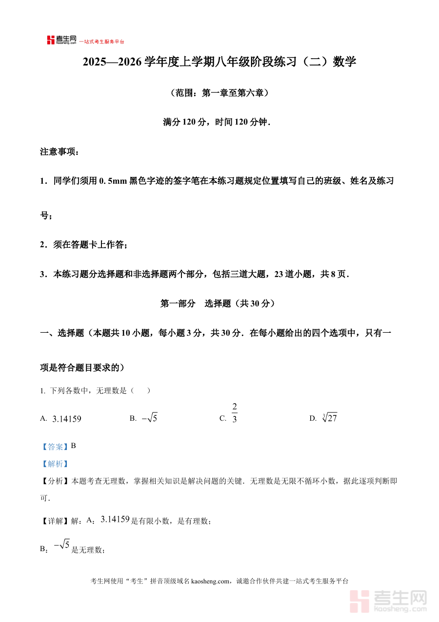 本资料适用于辽宁省沈阳市铁西区2025-2026学年上学期的八年级学生、数学教师及学生家长,通过对月考试题的专业解析,既支持学生完成阶段检测后的复盘提升,也为教师和家长提供科学的备考方向,提升备考的效率与精准度。