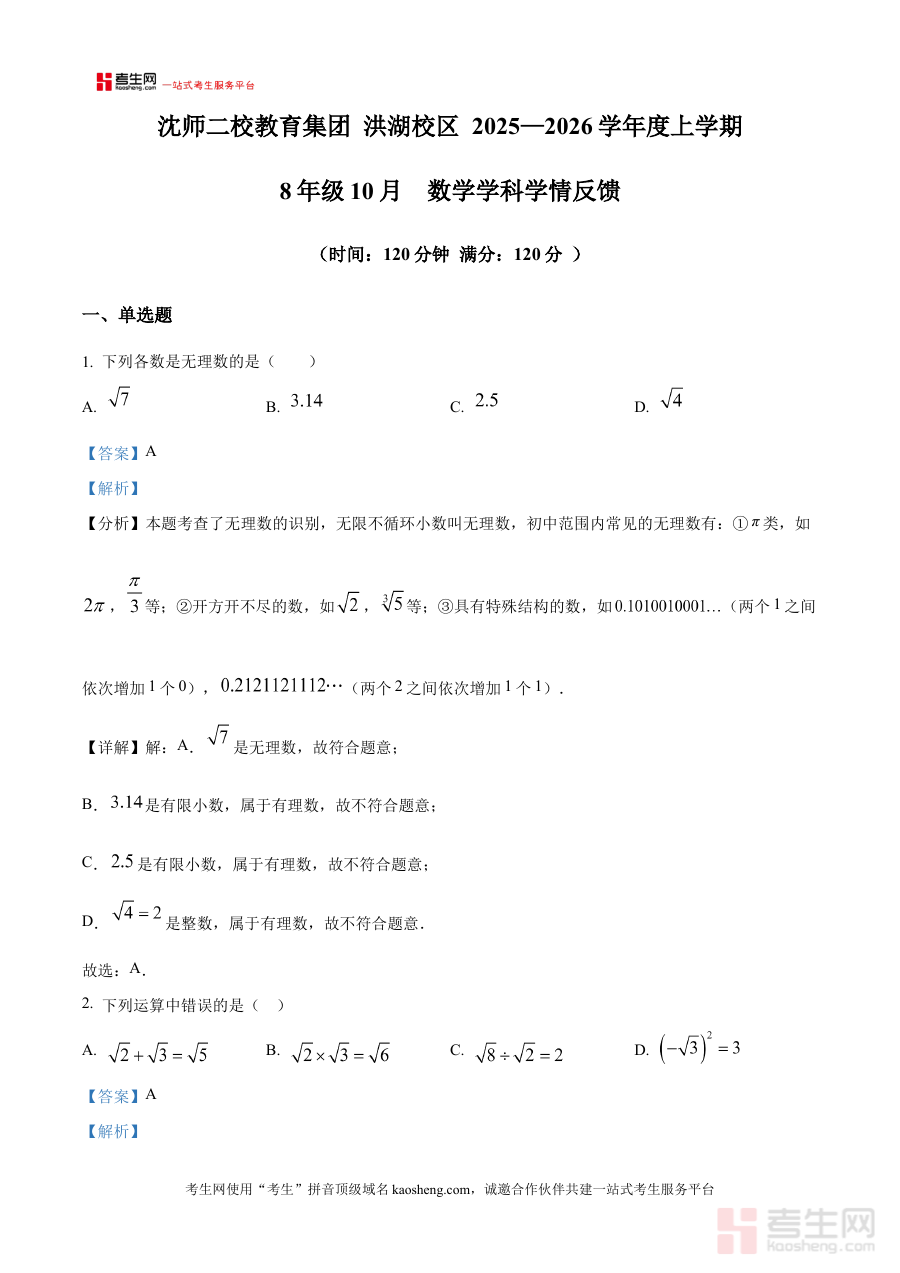 《精品解析:辽宁省沈阳师范大学附属第二中学教育集团2025--2026学年八年级上学期10月月考数学卷(解析版)》是面向辽宁省沈阳师范大学附属第二中学教育集团2025-2026学年八年级学生的上学期10月数学月考专属备考资料。该资料紧密结合该教育集团当学年的教学进度与10月月考的考查范围,精准匹配沈阳地区初中数学的阶段性学习要求,为学生提供与实际考试场景高度契合的复习资源。