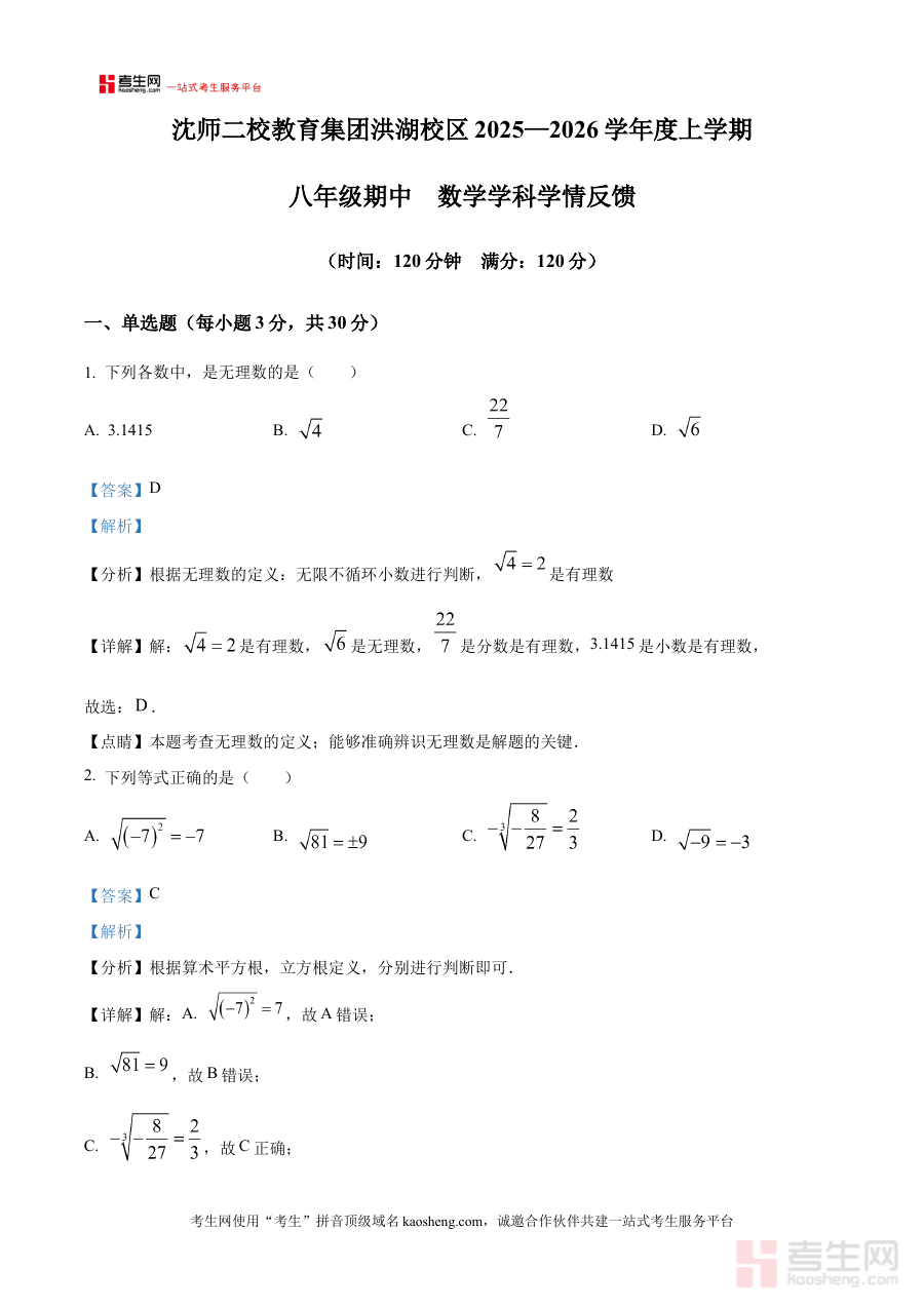 《精品解析:辽宁省沈阳市于洪区沈阳师范大学第二附属学校洪湖校区2025—2026学年八年级上学期期中考试数学试卷(解析版)》是针对辽宁省沈阳市于洪区该校区特定学年段期中数学考试的备考资料,精准匹配该校区八年级上学期的教学进度与考试要求,为学生提供贴合本地学情的复习支持。