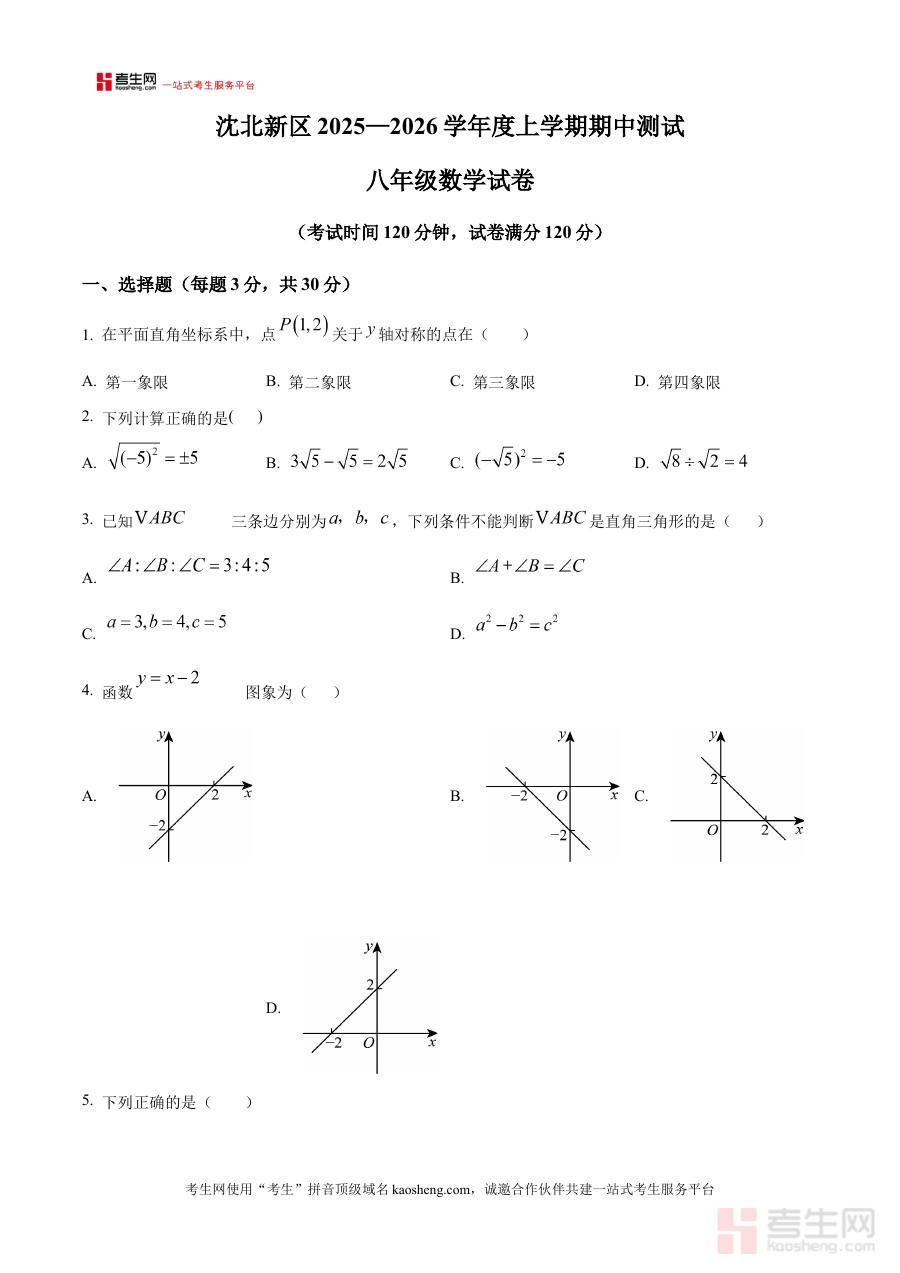 《精品解析:辽宁省沈阳市沈北新区2025—2026学年八年级上学期期中考试数学试卷(原卷版)》是针对辽宁省沈阳市沈北新区特定学年及学段的期中数学考试资料,精准对应当地教育教学进度与期中数学考试标准,为八年级学生提供了与实际考试高度一致的原卷呈现形式,是该阶段数学期中备考的核心资源之一。