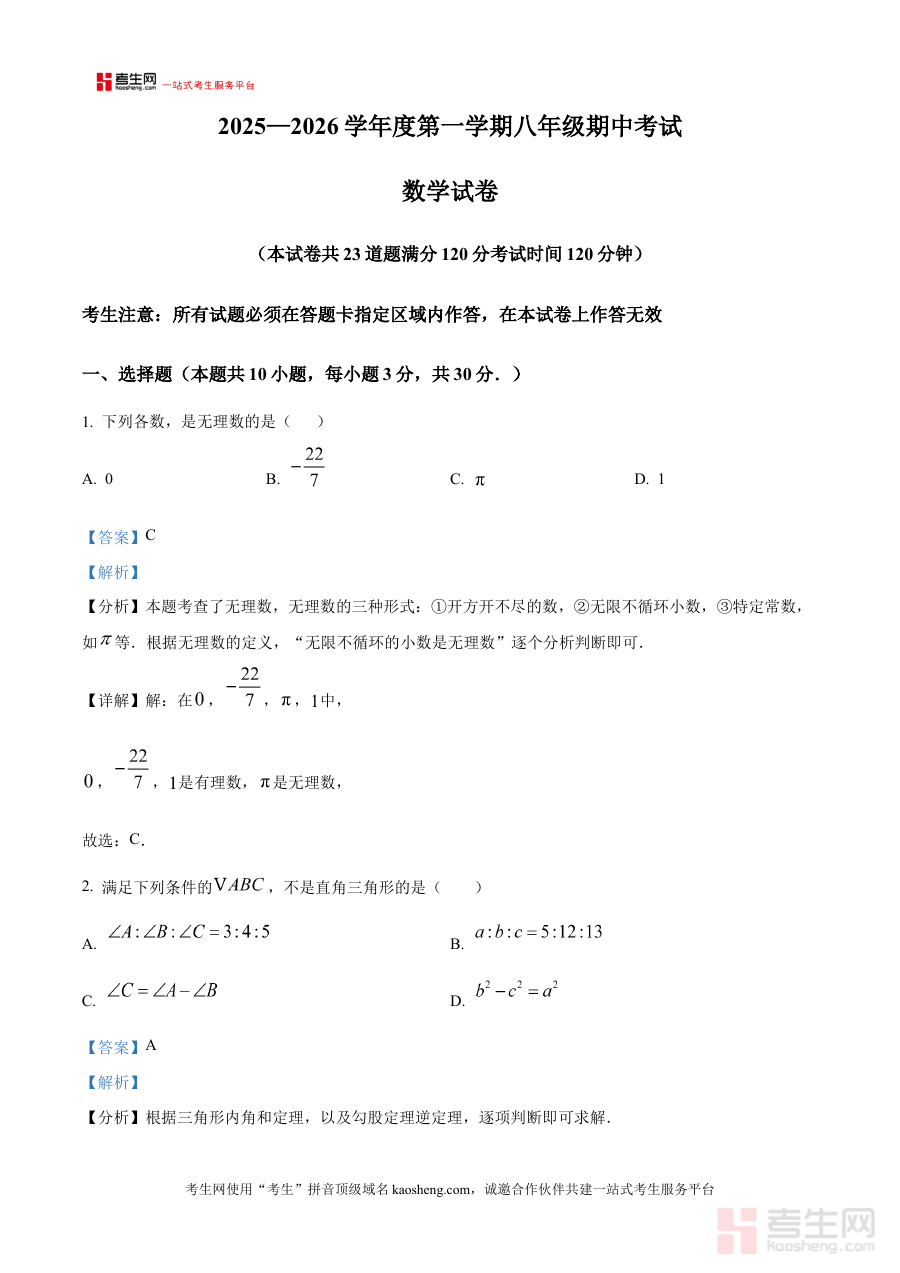 本资料适用于辽宁省沈阳市法库县2025-2026学年上学期的八年级学生、数学教师及家长。对学生而言,可作为阶段检测后的自我提升工具;对教师而言,能为教学评估与指导提供参考;对家长而言,有助于了解孩子学习状况并配合学校辅导,共同促进学生数学能力提升。