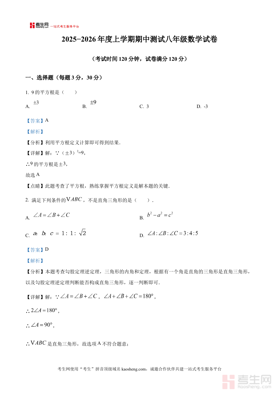 《精品解析:辽宁省沈阳市第一七五中学2025-2026学年八年级上学期期中考试数学试卷(解析版)》是面向辽宁省沈阳市第一七五中学2025至2026学年八年级学生打造的上学期期中考试数学学科备考资料,紧密贴合该校该学年八年级上学期期中检测的实际需求,为学生提供与校内考试高度适配的复习资源,助力学生提前熟悉考试的整体框架与考查方向。