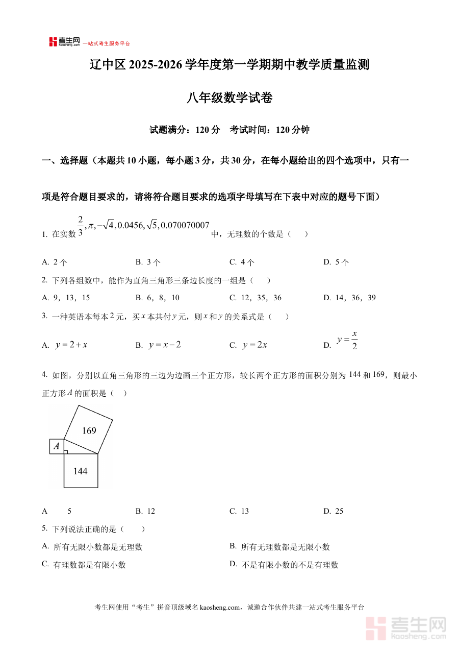 《精品解析:辽宁省沈阳市辽中区2025-2026学年八年级上学期期中教学质量监测数学试卷(原卷版)》是针对辽宁省沈阳市辽中区2025-2026学年八年级上学期期中教学质量监测的数学学科专属备考资料,精准贴合该地区特定学年段数学学科期中检测的实际需求,为师生提供与本地考试直接对应的参考内容。