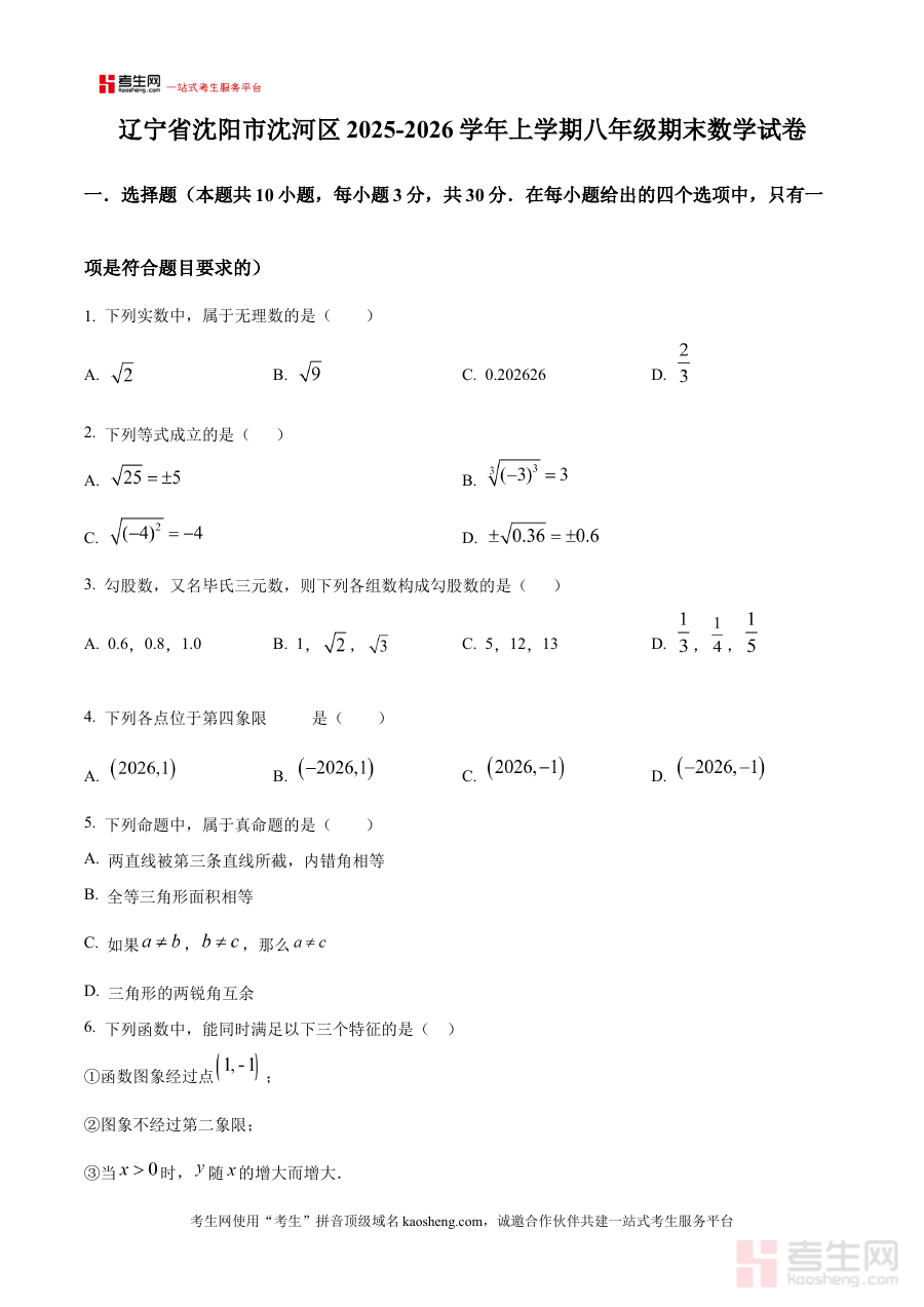 《精品解析:辽宁省沈阳市沈河区2025-2026学年上学期八年级期末数学试卷(原卷版)》是针对辽宁省沈阳市沈河区2025至2026学年第一学期八年级数学期末水平测试的备考资料,精准对应该区域该学段的期末考核需求,为使用者提供贴合本地教学进度与考试标准的参考依据。