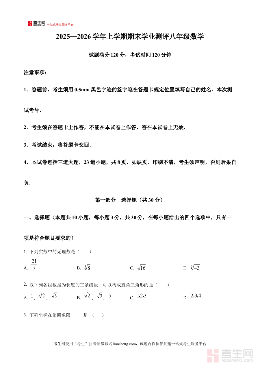 《精品解析:辽宁省沈阳市浑南区2025-2026学年八年级上学期数学期末学业水平测试题(原卷版)》是面向辽宁省沈阳市浑南区特定学年段的数学学科期末学业水平测试配套备考资料,精准对应2025-2026学年八年级上学期的期末测试场景,契合该地区的教学进度与考试评价要求。