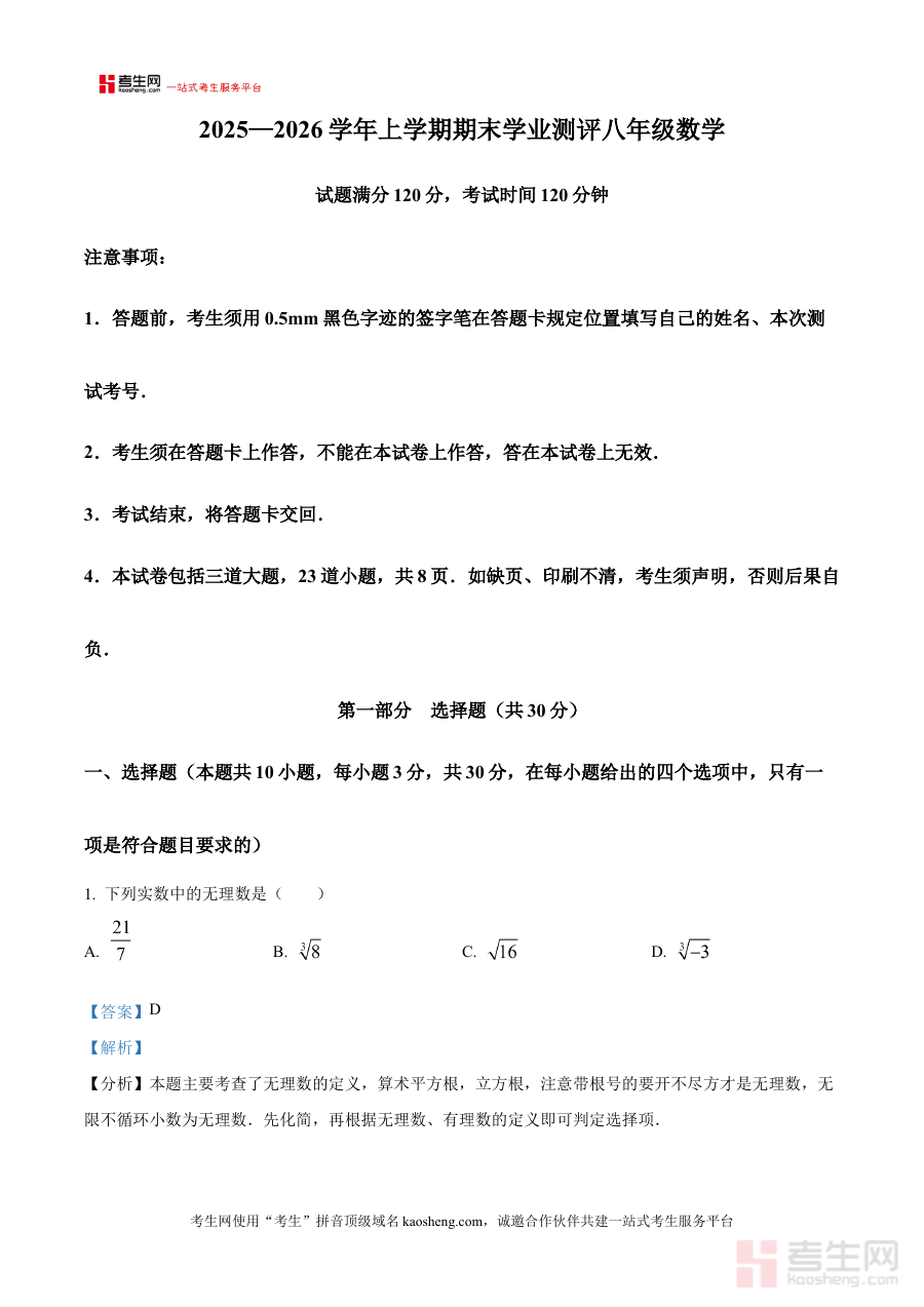 《精品解析:辽宁省沈阳市浑南区2025-2026学年八年级上学期数学期末学业水平测试题(解析版)》是针对辽宁省沈阳市浑南区2025-2026学年八年级学生打造的数学期末学业水平测试备考资料。该资料紧密围绕该地区该学年八年级上学期数学期末学业水平测试的核心需求,为使用者提供与考试直接相关的解析内容支持,帮助使用者准确把握考试的整体框架与关键方向。