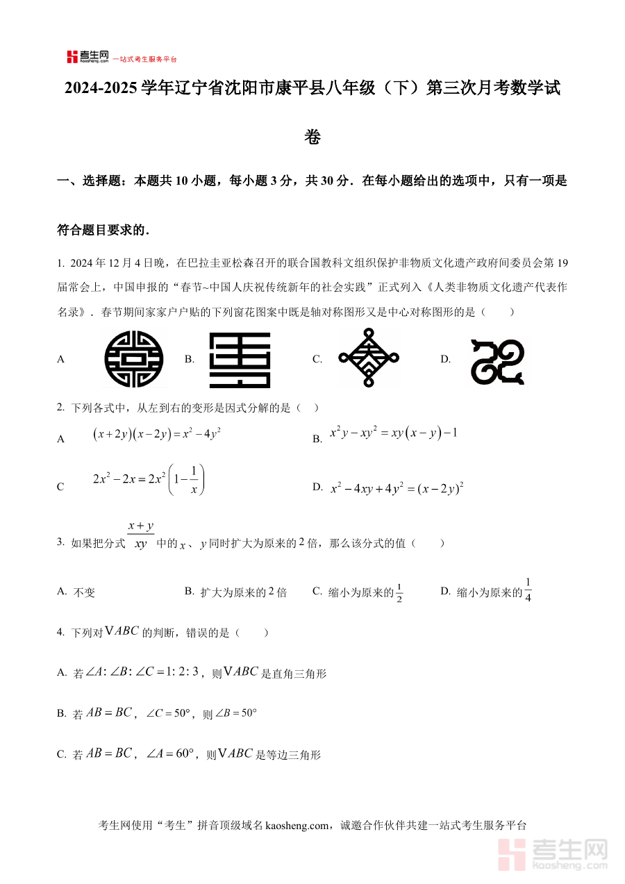 《精品解析:辽宁省沈阳市康平县2024-2025学年八年级下学期第三次月考数学试卷(原卷版)》是针对辽宁省沈阳市康平县2024-2025学年八年级下学期第三次月考数学科目的专用备考资料,紧密贴合该地区当学年八年级数学教学进度与月考命题方向,为使用者提供与实际考试场景高度匹配的练习资源。