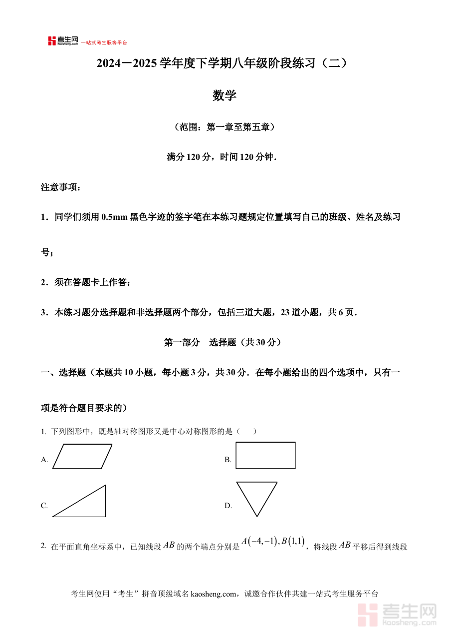 《精品解析:辽宁省沈阳市民办初中2024--2025学年八年级下学期5月考数学试卷(原卷版)》是针对辽宁省沈阳市2024至2025学年民办初中八年级下学期5月月考的数学学科原卷资料,精准匹配当地民办初中的教学进度与考试标准,属于该阶段学生数学学习的阶段性考试备考资源,能够为使用者提供符合本地考试特点的真实试卷参考。