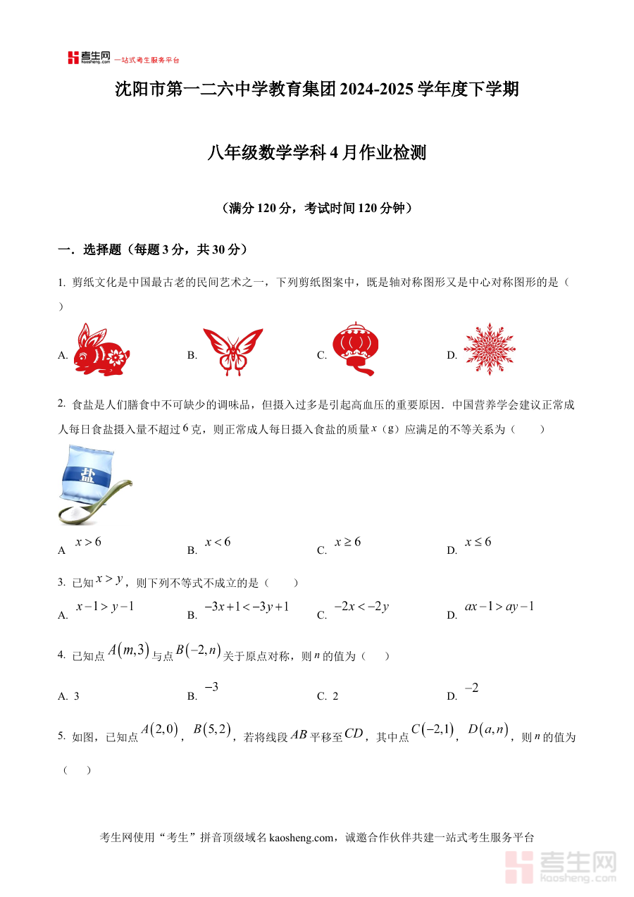 《精品解析:辽宁省沈阳市沈阳市第一二六中学教育集团2024—2025学年八年级下学期4月月考数学试卷及答案(原卷版)》是针对辽宁省沈阳市第一二六中学教育集团2024-2025学年八年级下学期4月数学月考设计的配套备考资料,涵盖原卷及对应答案解析两部分内容,精准贴合该学校集团在该学年该阶段的教学进度与月考考查要求,为相关使用者提供与实际考试高度匹配的参考素材。