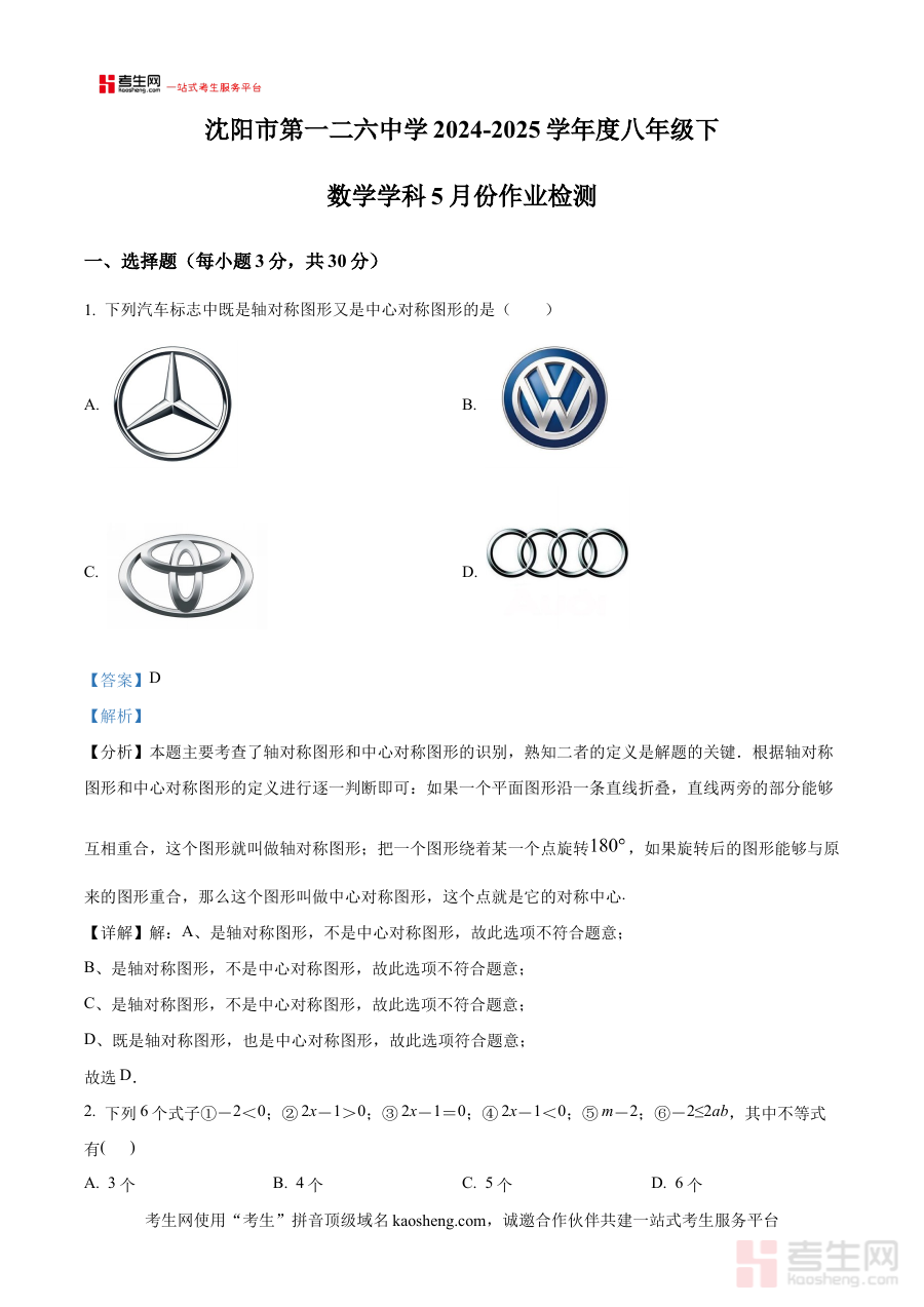 《精品解析:辽宁省沈阳市第一二六中学2024-2025学年八年级下学期数学学科作业检测试卷(5月)(解析版)》是针对辽宁省沈阳市第一二六中学2024-2025学年八年级下学期5月数学作业检测的配套解析资料,聚焦该阶段数学学科的阶段性学习成果检验需求,为相关使用者提供专业的参考依据。