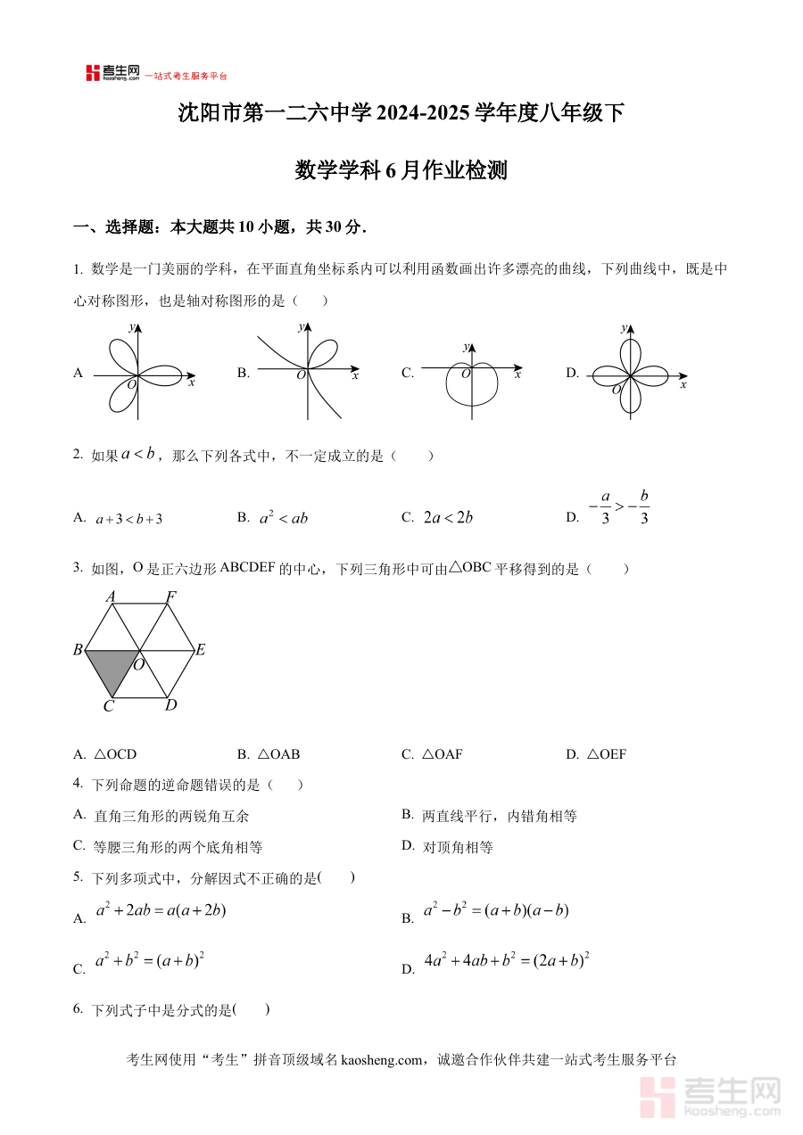 《精品解析:辽宁省沈阳市第一二六中学2024-2025学年下学期八年级数学6月作业检测(原卷版)》是辽宁省沈阳市第一二六中学针对2024-2025学年下学期八年级学生推出的数学阶段性作业检测资料,对应该学年下学期6月的学习进度,以原卷形式呈现检测内容,是适配该阶段数学学习需求的针对性备考资源。
