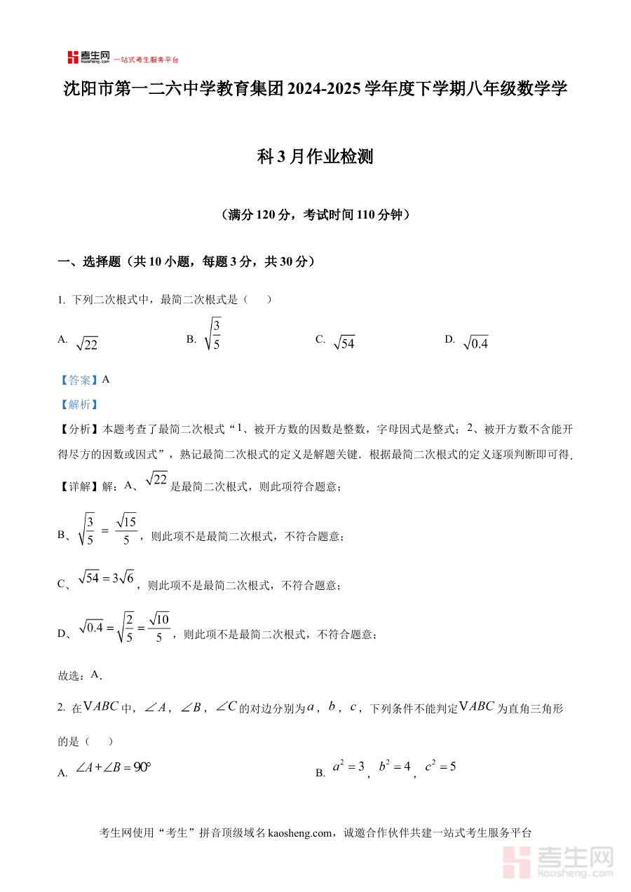 《精品解析:辽宁省沈阳市第一二六中学2024-2025学年八年级下学期3月考试数学试卷(解析版)》是针对辽宁省沈阳市第一二六中学特定学年学段的数学考试解析资料。该资料对应2024-2025学年八年级下学期3月的校内考试,聚焦沈阳地区该学校八年级学生的数学学习阶段性检测需求,作为解析版资料,其核心定位是为相关群体提供与本次考试直接关联的备考支持与学习参考,明确了考试的时间节点、学校范围、学段及学科属性。