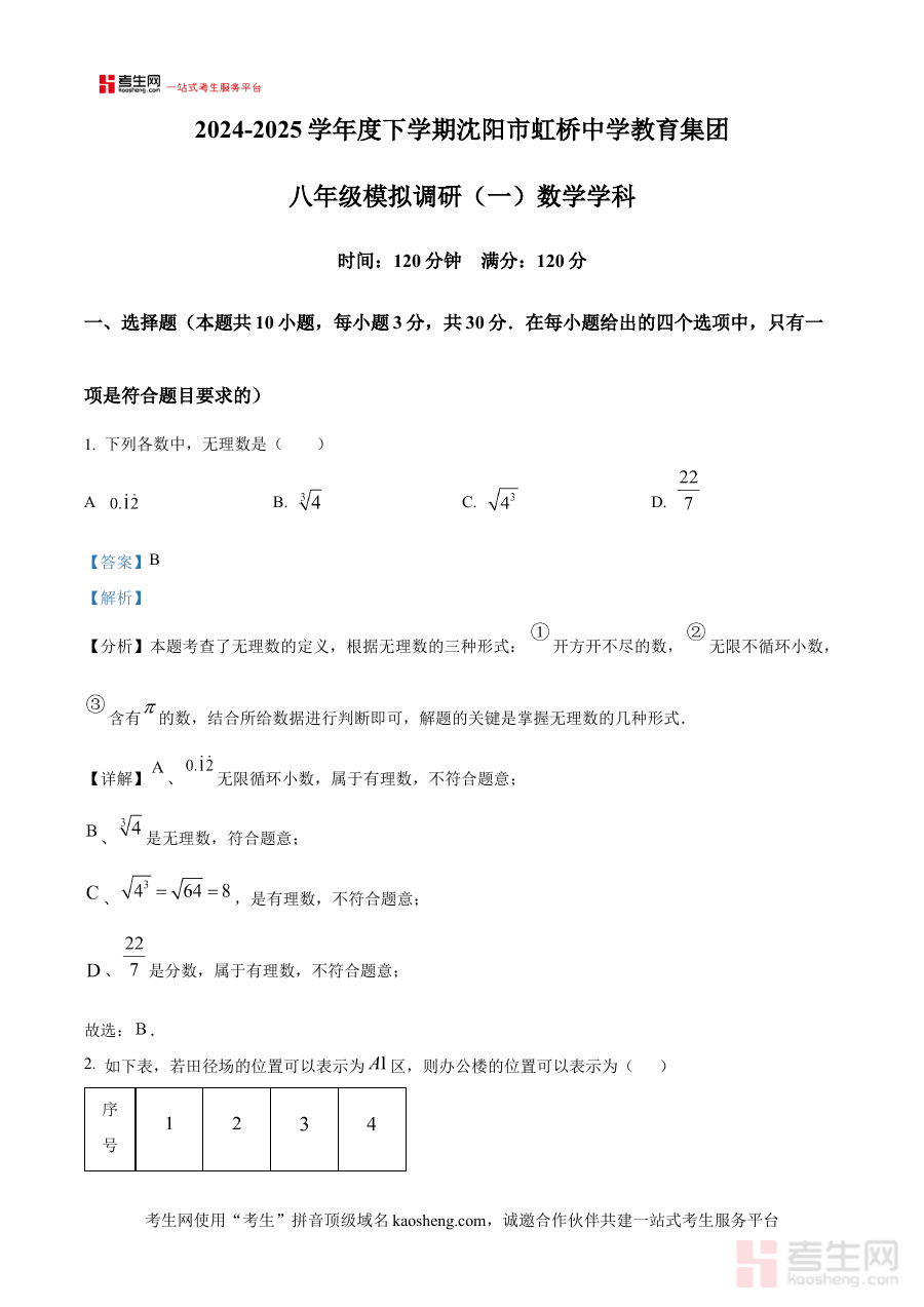 《精品解析:辽宁省沈阳市虹桥教育集团2024-2025学年八年级下学期开学考试数学试题(解析版)》是针对辽宁省沈阳市虹桥教育集团在2024-2025学年八年级下学期开学阶段组织的数学考试所编制的备考资料,聚焦该特定时间节点与区域教育集团的考试需求,为相关使用者提供精准的内容支持。