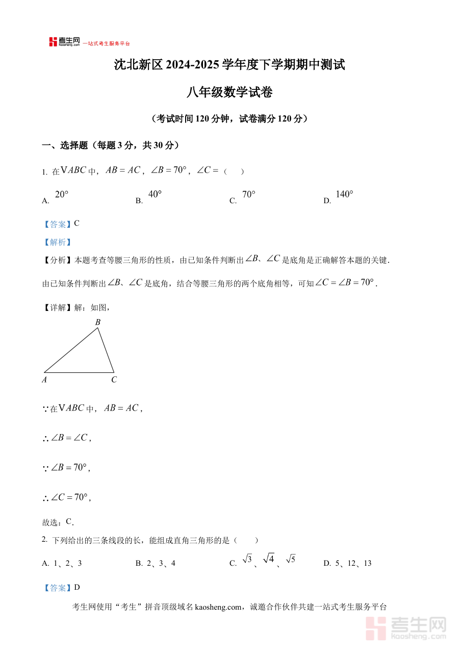 《精品解析:辽宁省沈阳市沈北新区2024-2025学年八年级下学期期中数学试卷(解析版)》是针对辽宁省沈阳市沈北新区2024至2025学年八年级下学期期中数学考试的配套备考资料,精准匹配该地区该学年该阶段的数学教学进度与考试要求,为使用者提供贴合本地学情的参考依据。